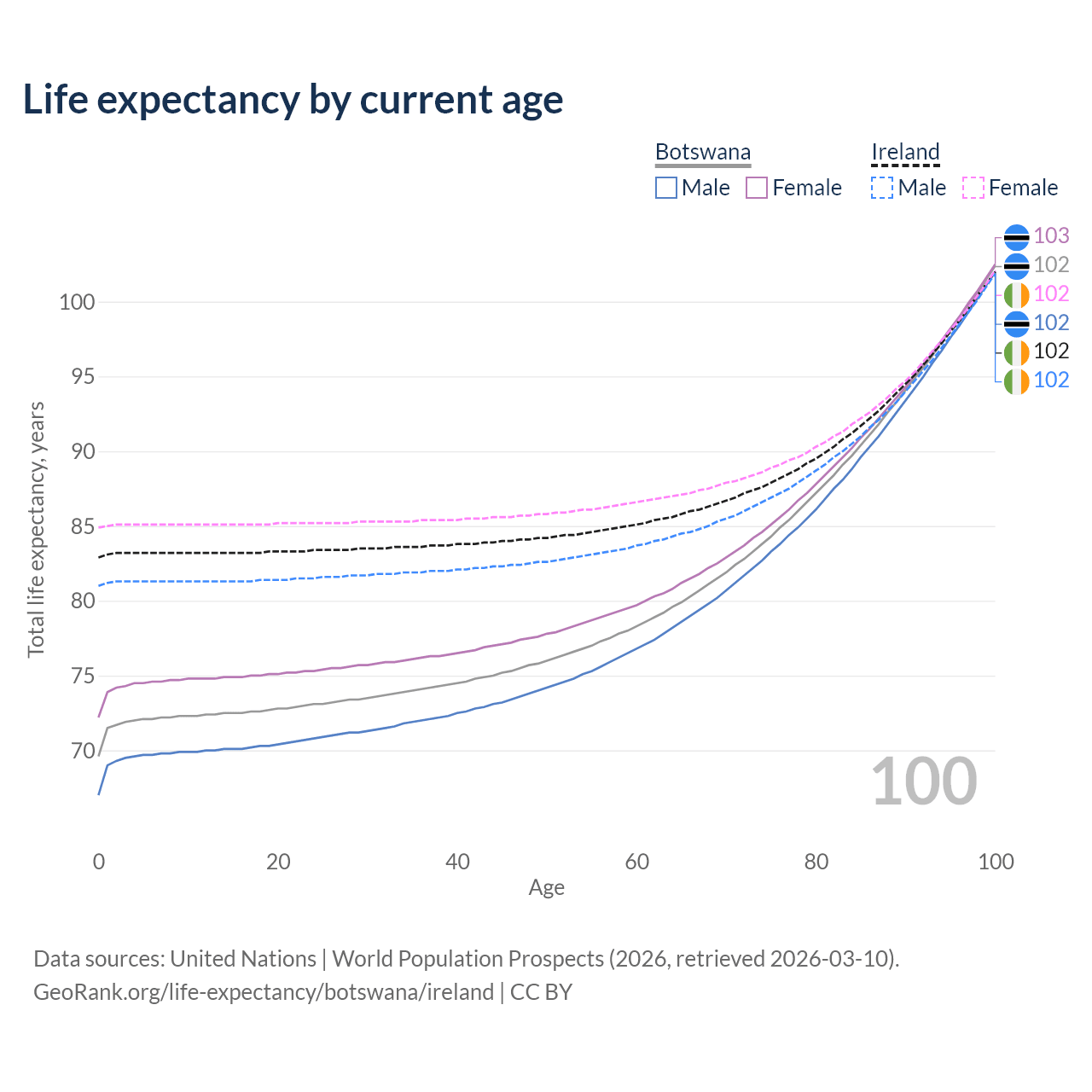 This life expectancy calculator shows the odds of living to 100, 95, 90, and below based on current age for both males and females in Botswana and Ireland, along with mean and median age of death. The calculations are based on the 2026 life tables (actuarial tables) from the UN World Population Prospects.
