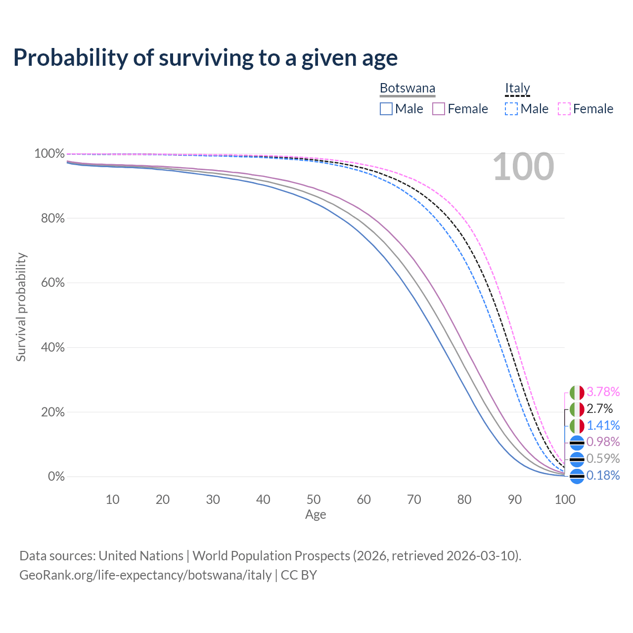 This life expectancy calculator shows the odds of living to 100, 95, 90, and below based on current age for both males and females in Botswana and Italy, along with mean and median age of death. The calculations are based on the 2026 life tables (actuarial tables) from the UN World Population Prospects.