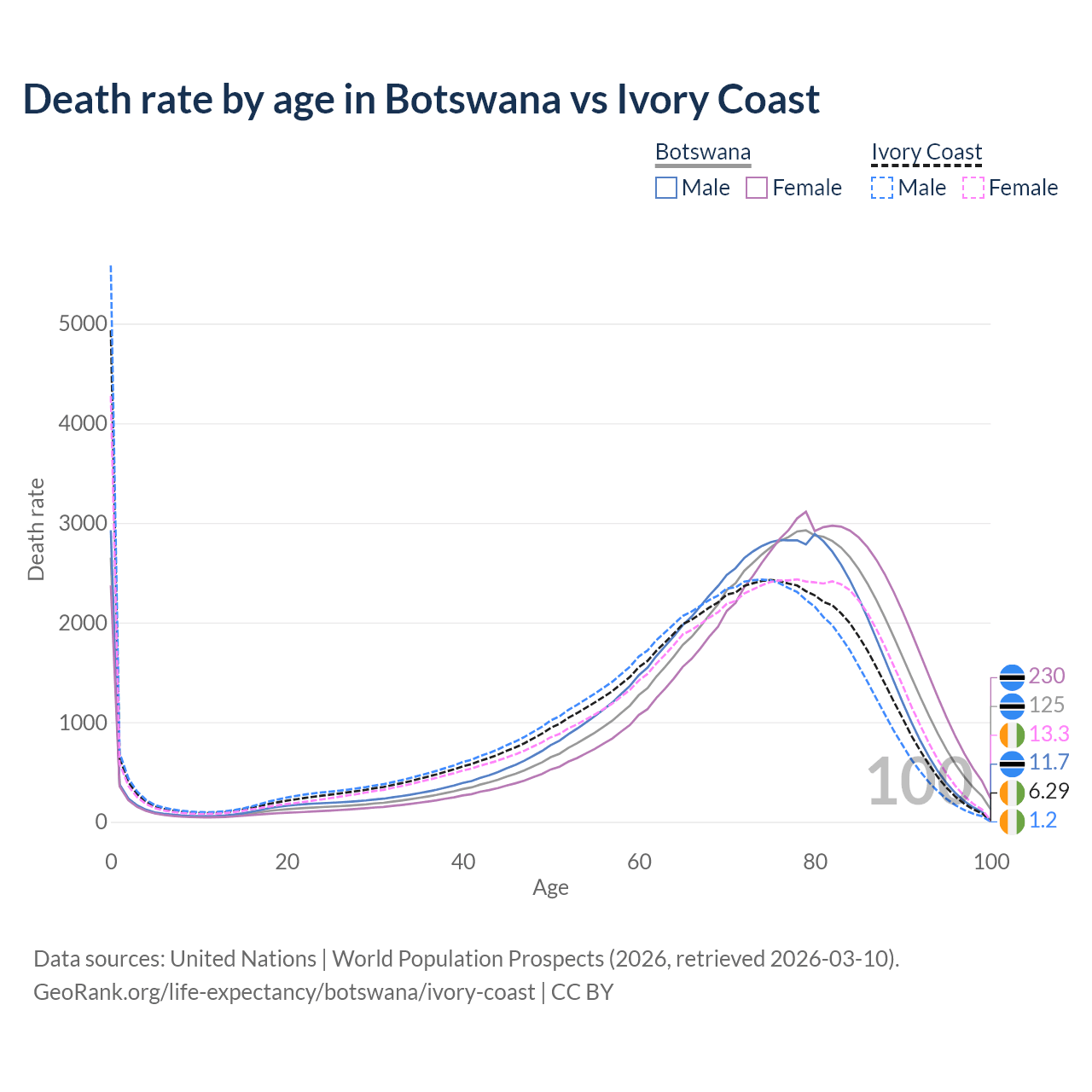 In Botswana, the most common age of death is 79, compared to 0 in Ivory Coast. The median age of death is 74.4 in Botswana and 68.6 in Ivory Coast, meaning only half of each cohort is expected to live past that age.