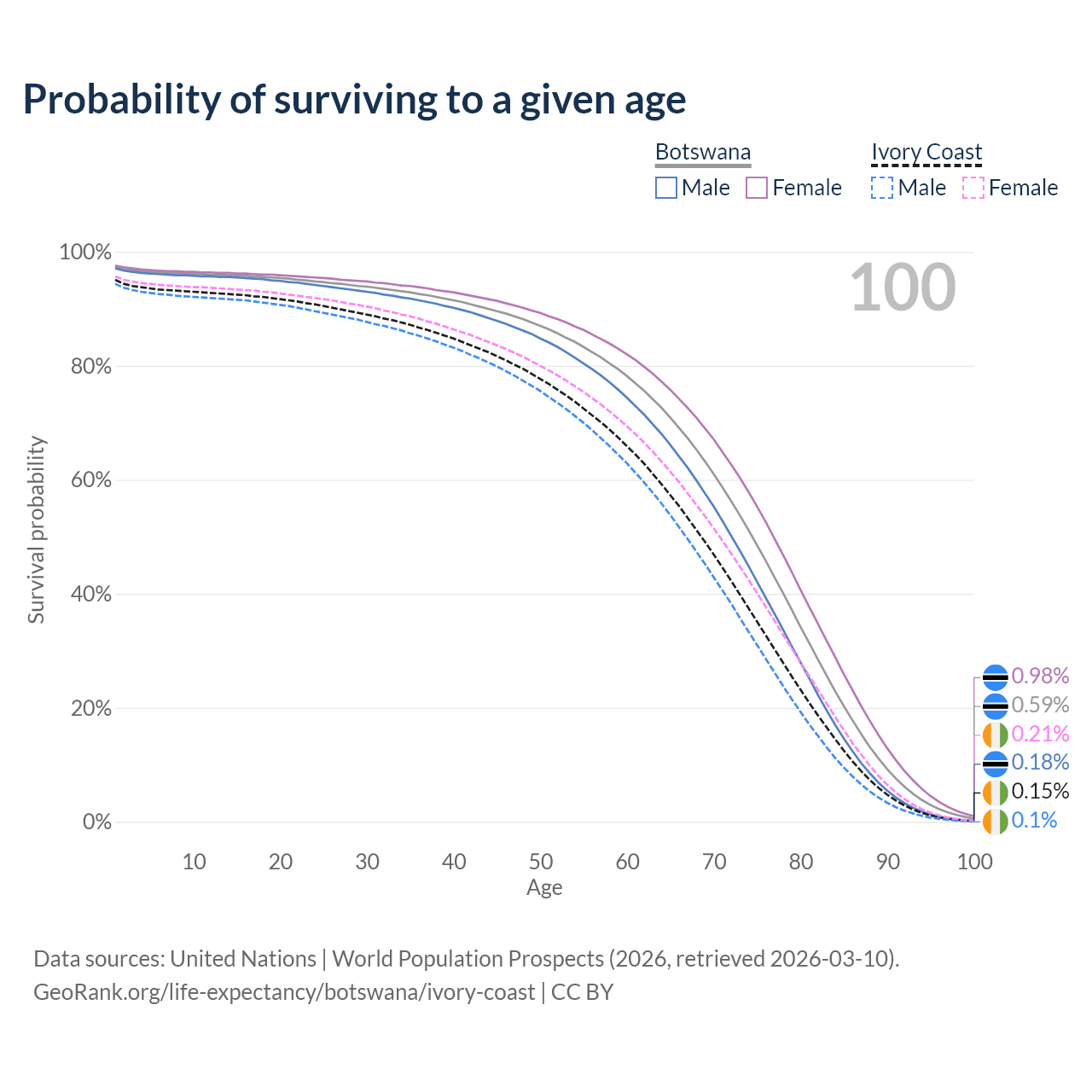 This life expectancy calculator shows the odds of living to 100, 95, 90, and below based on current age for both males and females in Botswana and Ivory Coast, along with mean and median age of death. The calculations are based on the 2026 life tables (actuarial tables) from the UN World Population Prospects.