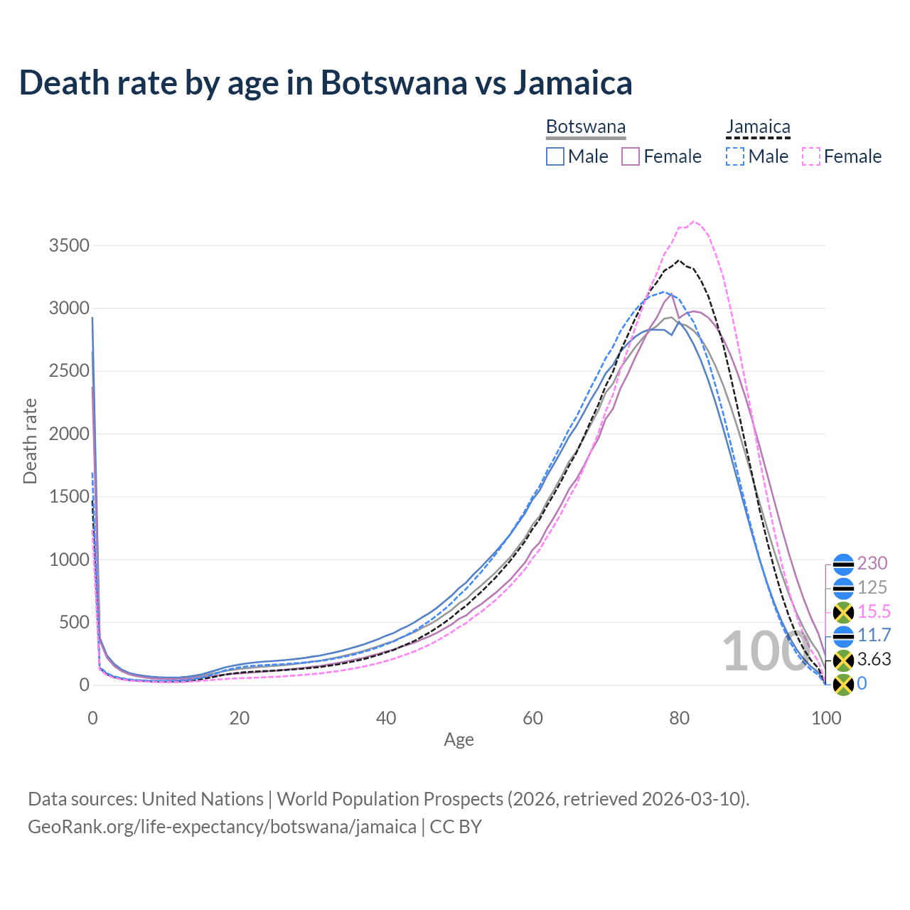 Note that this chart does not show rates per 100,000 population, as those would be skewed by age structure differences and reflect the demographics of Botswana and Jamaica more than their death rates.