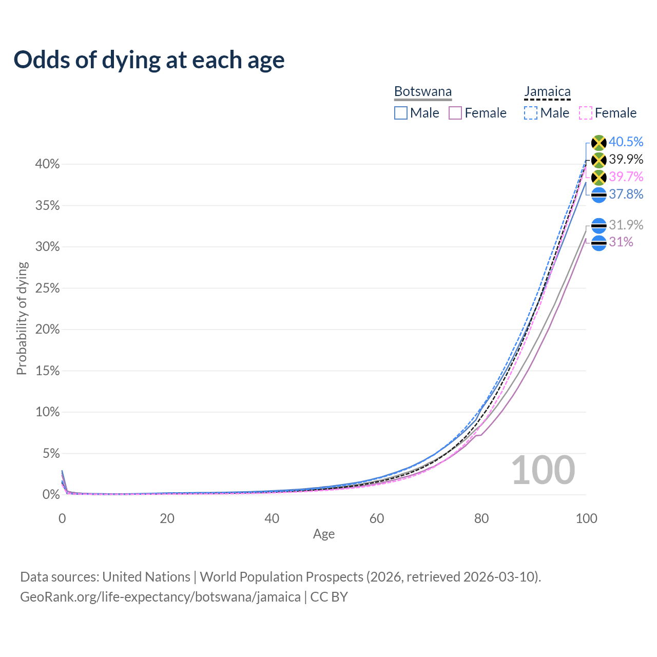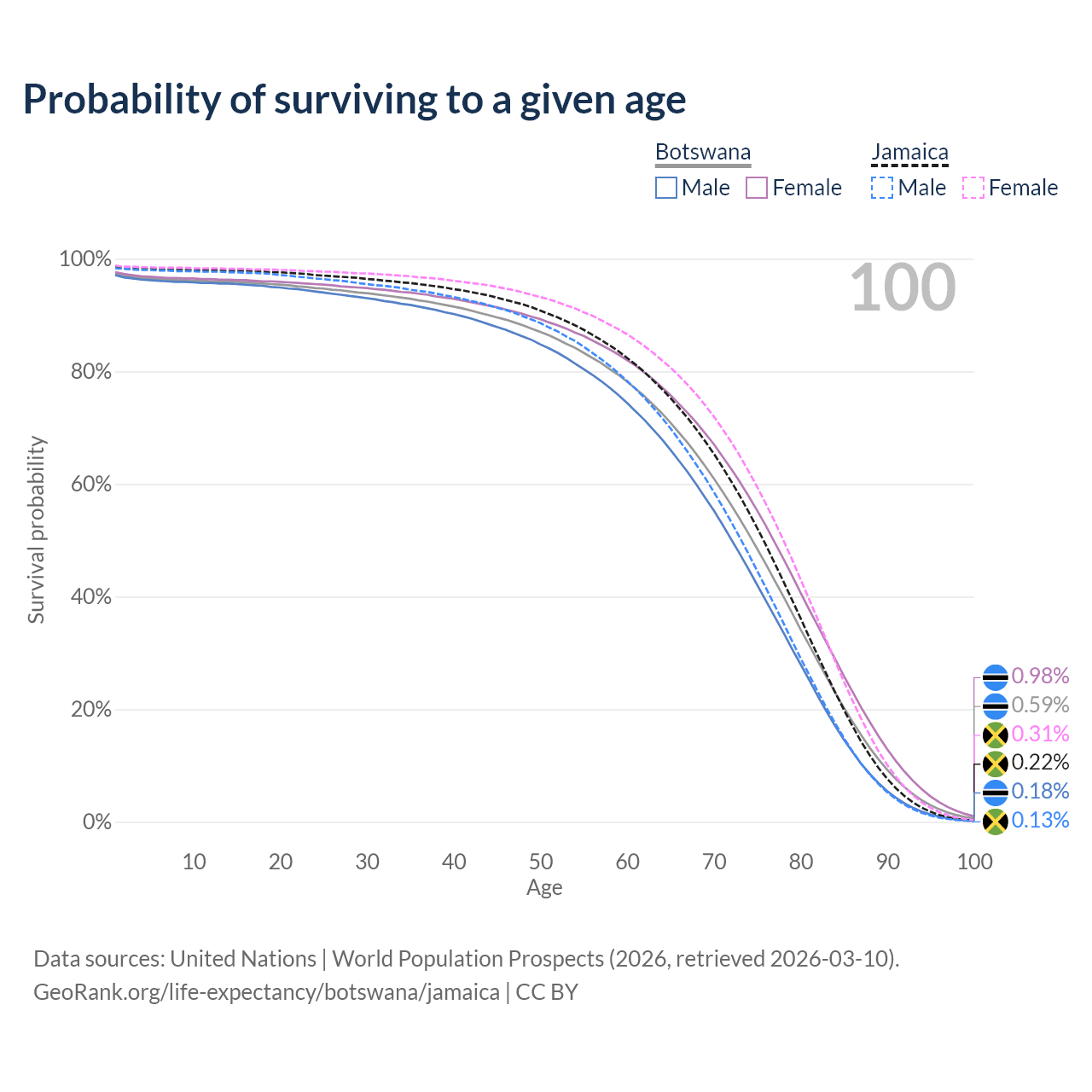 This life expectancy calculator shows the odds of living to 100, 95, 90, and below based on current age for both males and females in Botswana and Jamaica, along with mean and median age of death. The calculations are based on the 2026 life tables (actuarial tables) from the UN World Population Prospects.
