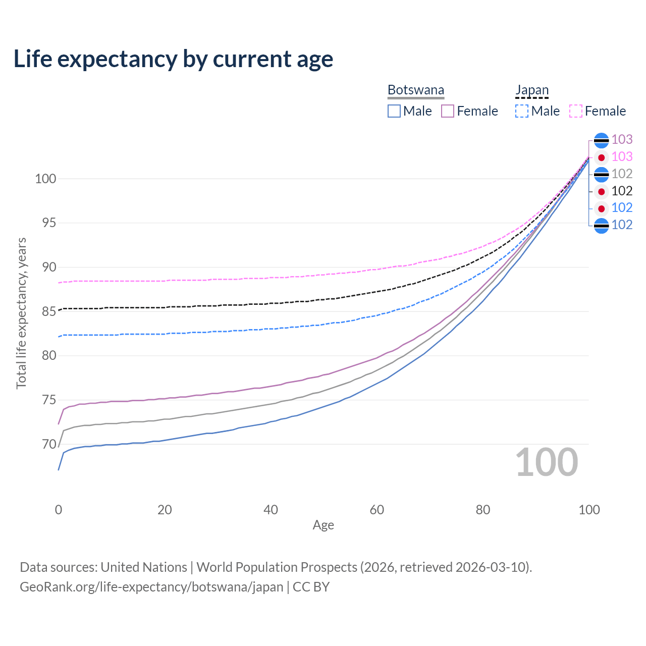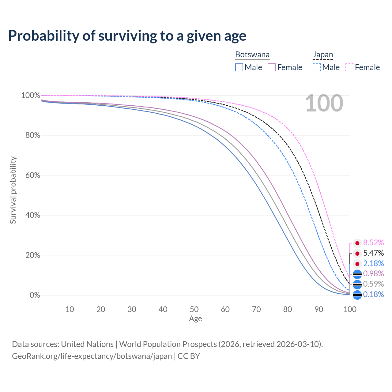 This life expectancy calculator shows the odds of living to 100, 95, 90, and below based on current age for both males and females in Botswana and Japan, along with mean and median age of death. The calculations are based on the 2026 life tables (actuarial tables) from the UN World Population Prospects.