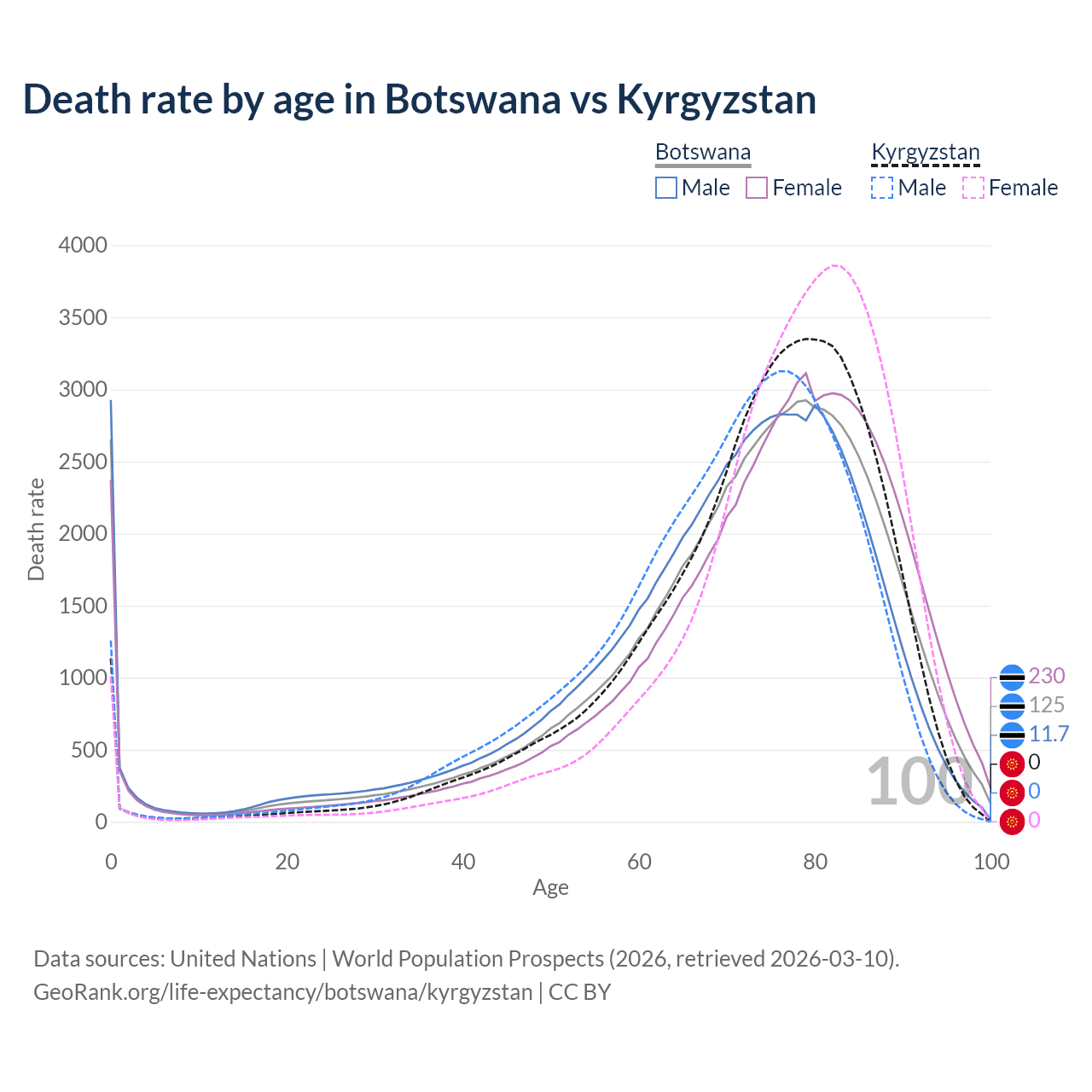 In Botswana, the most common age of death is 79, compared to 79 in Kyrgyzstan. The median age of death is 74.4 in Botswana and 75.6 in Kyrgyzstan, meaning only half of each cohort is expected to live past that age.