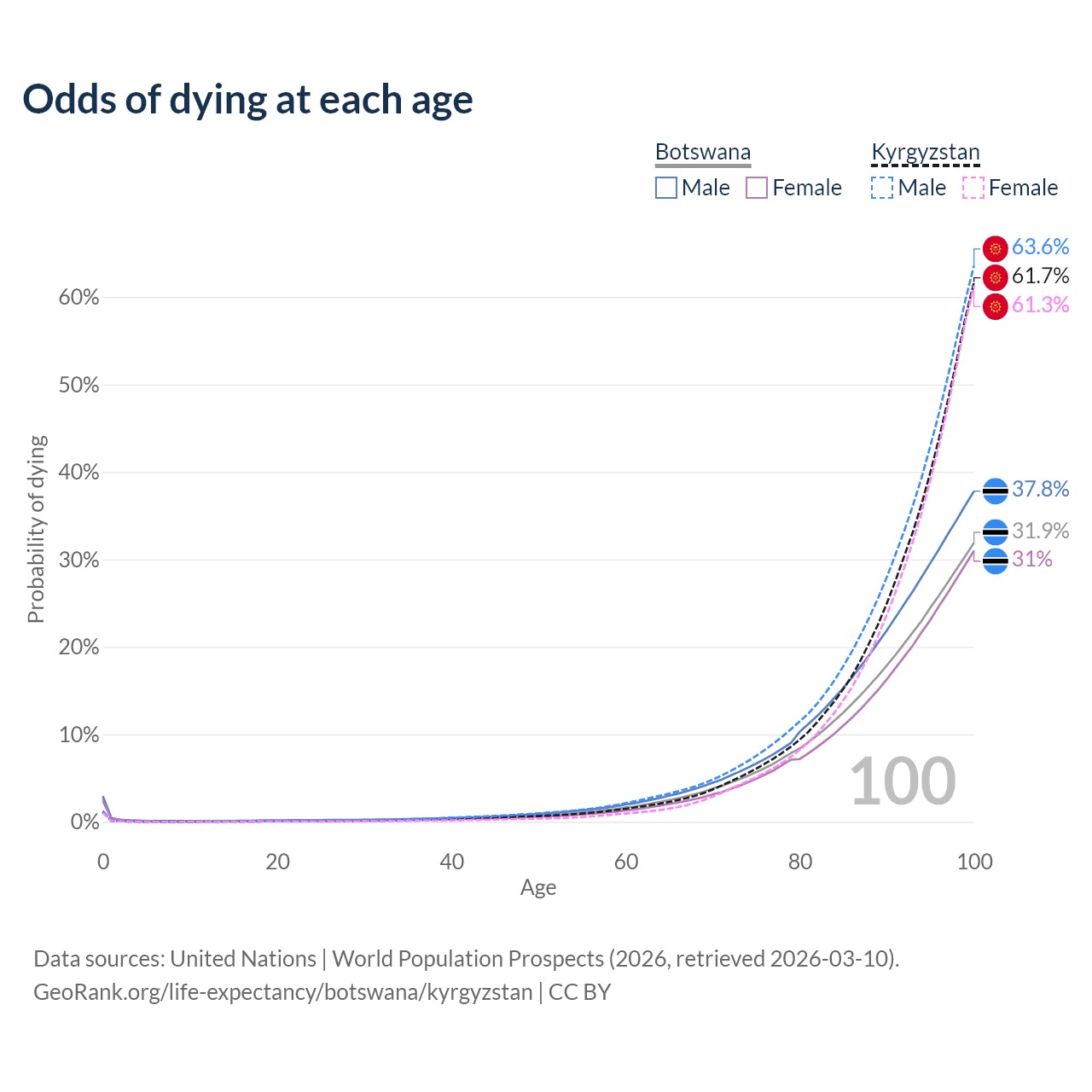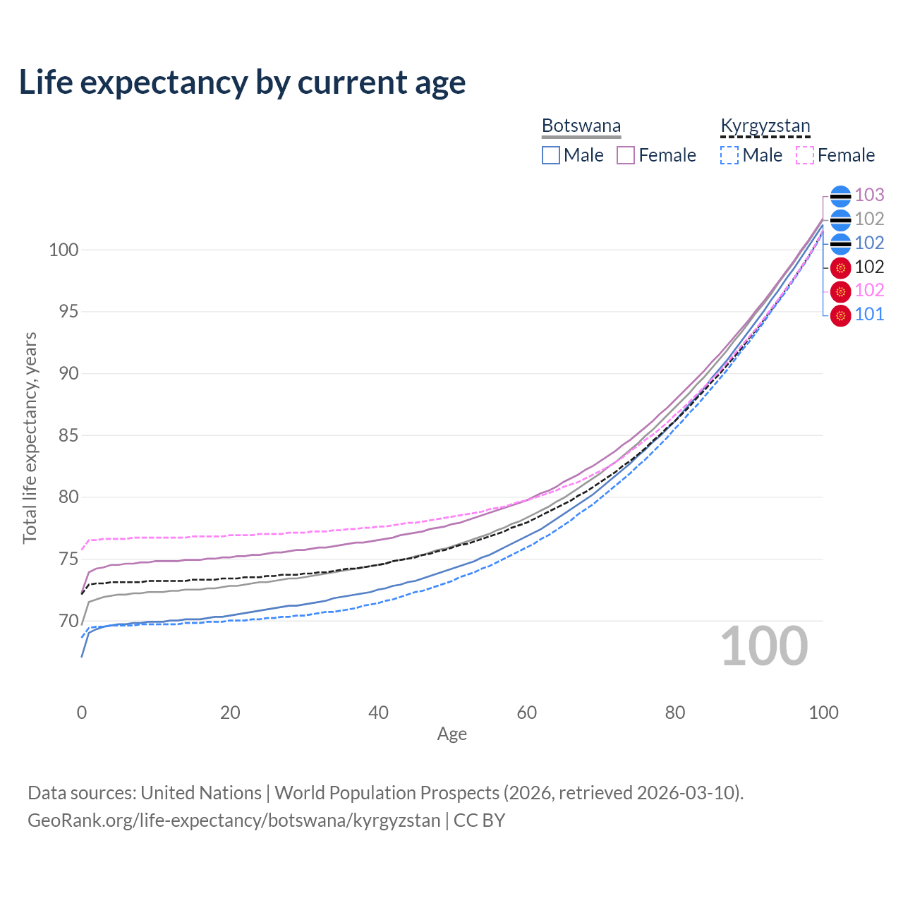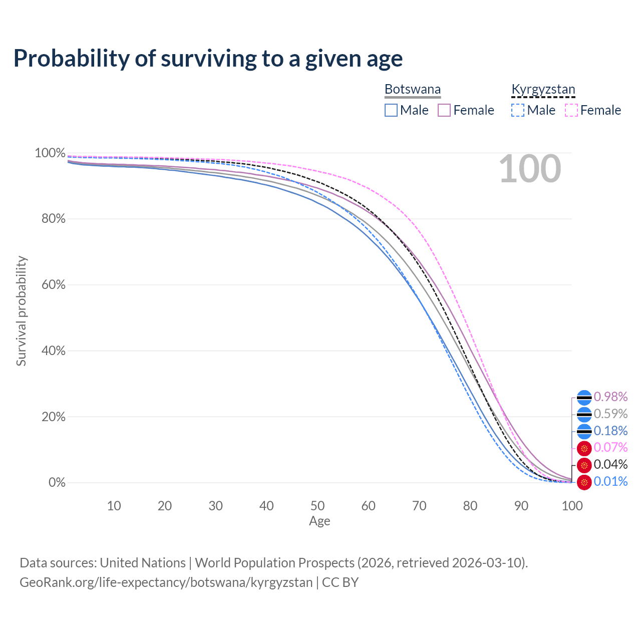 This life expectancy calculator shows the odds of living to 100, 95, 90, and below based on current age for both males and females in Botswana and Kyrgyzstan, along with mean and median age of death. The calculations are based on the 2026 life tables (actuarial tables) from the UN World Population Prospects.