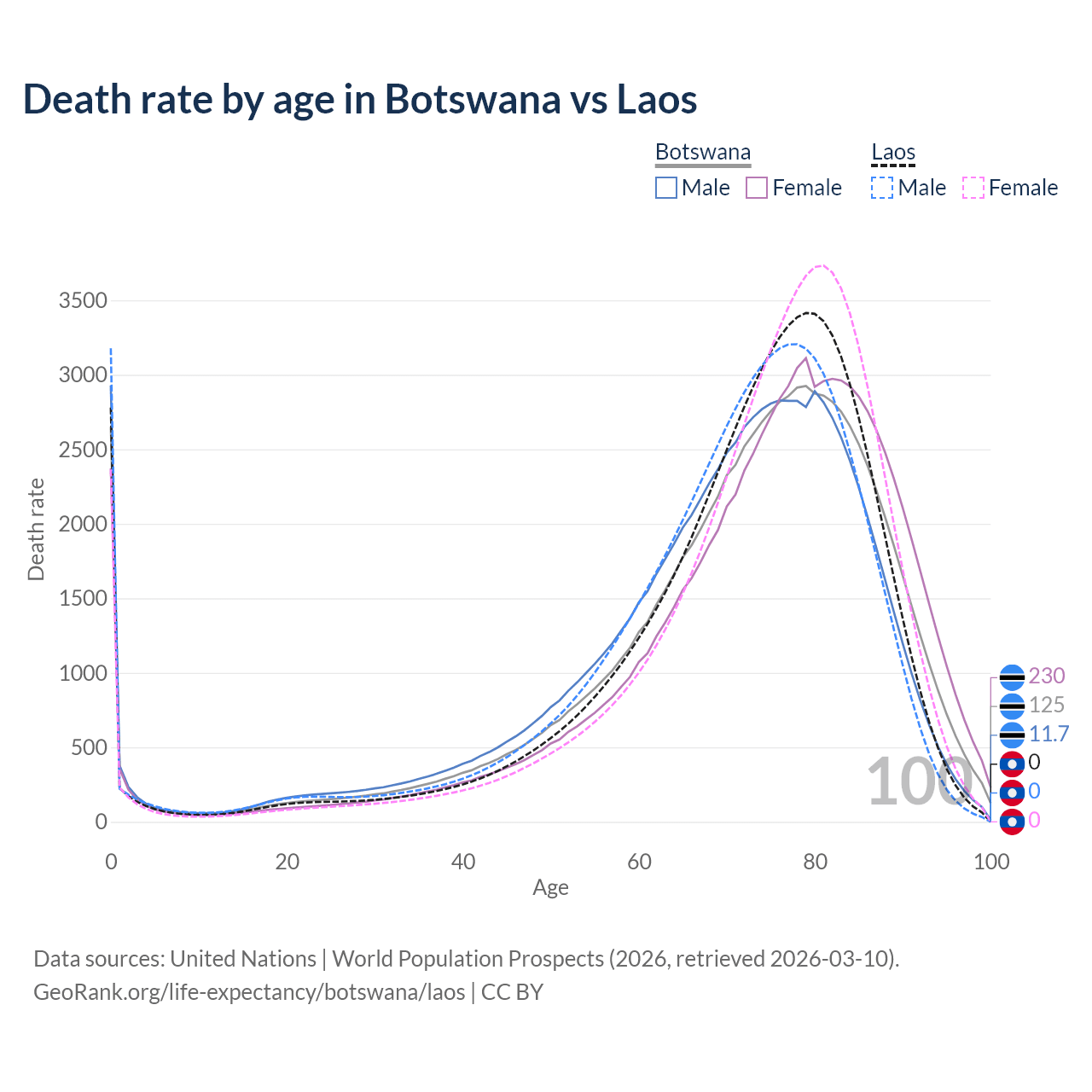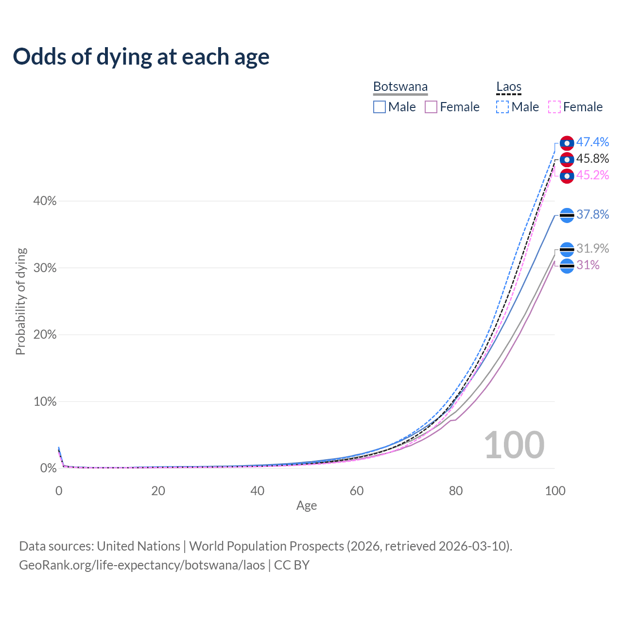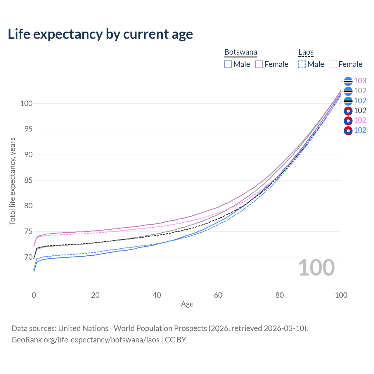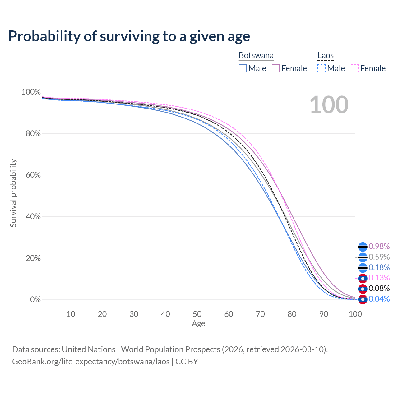 This life expectancy calculator shows the odds of living to 100, 95, 90, and below based on current age for both males and females in Botswana and Laos, along with mean and median age of death. The calculations are based on the 2026 life tables (actuarial tables) from the UN World Population Prospects.