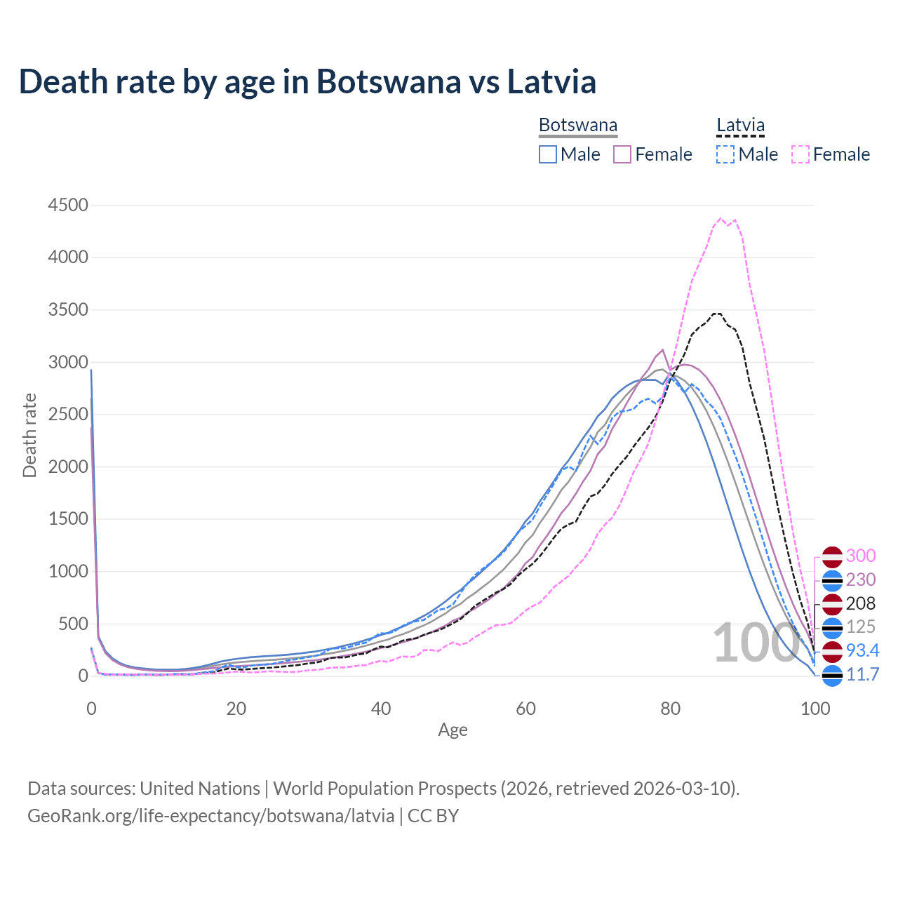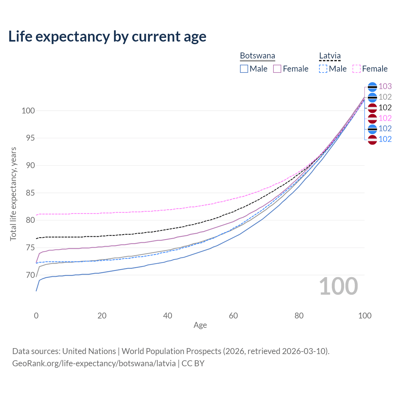 This life expectancy calculator shows the odds of living to 100, 95, 90, and below based on current age for both males and females in Botswana and Latvia, along with mean and median age of death. The calculations are based on the 2026 life tables (actuarial tables) from the UN World Population Prospects.