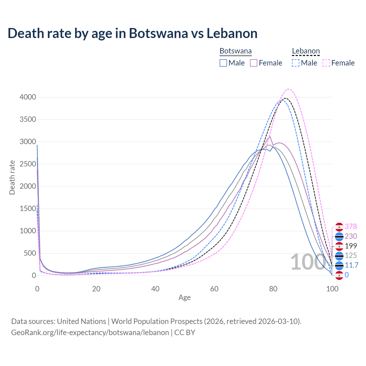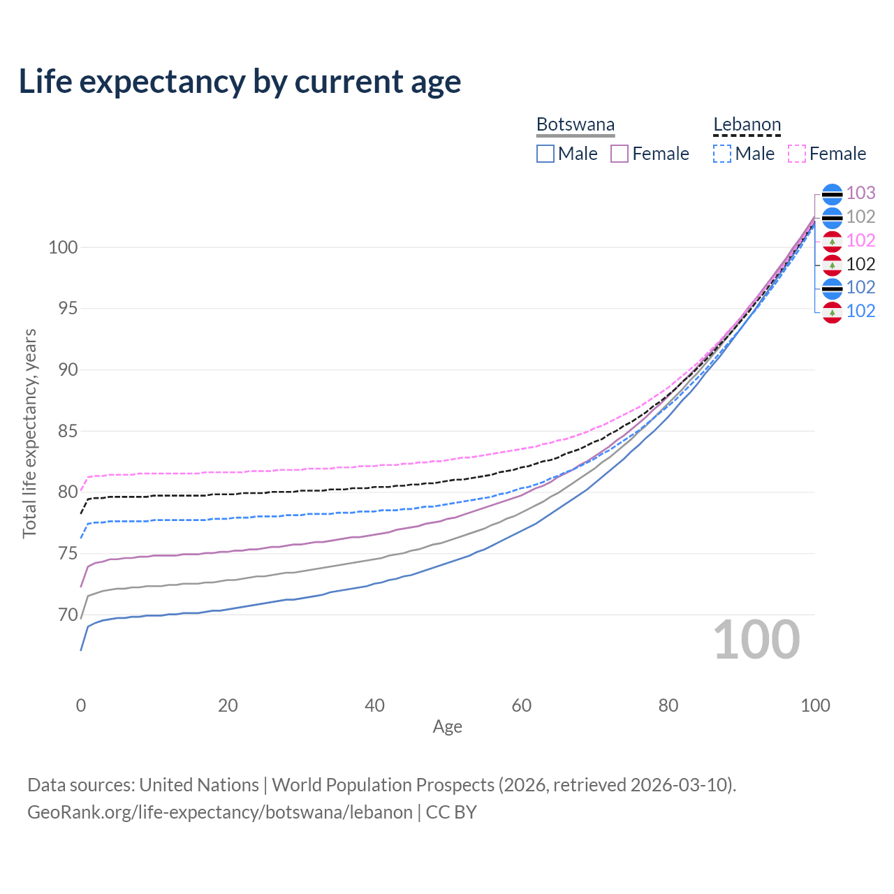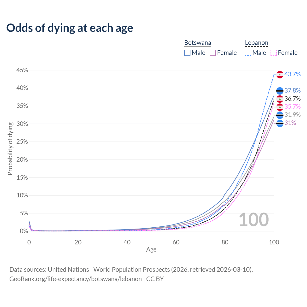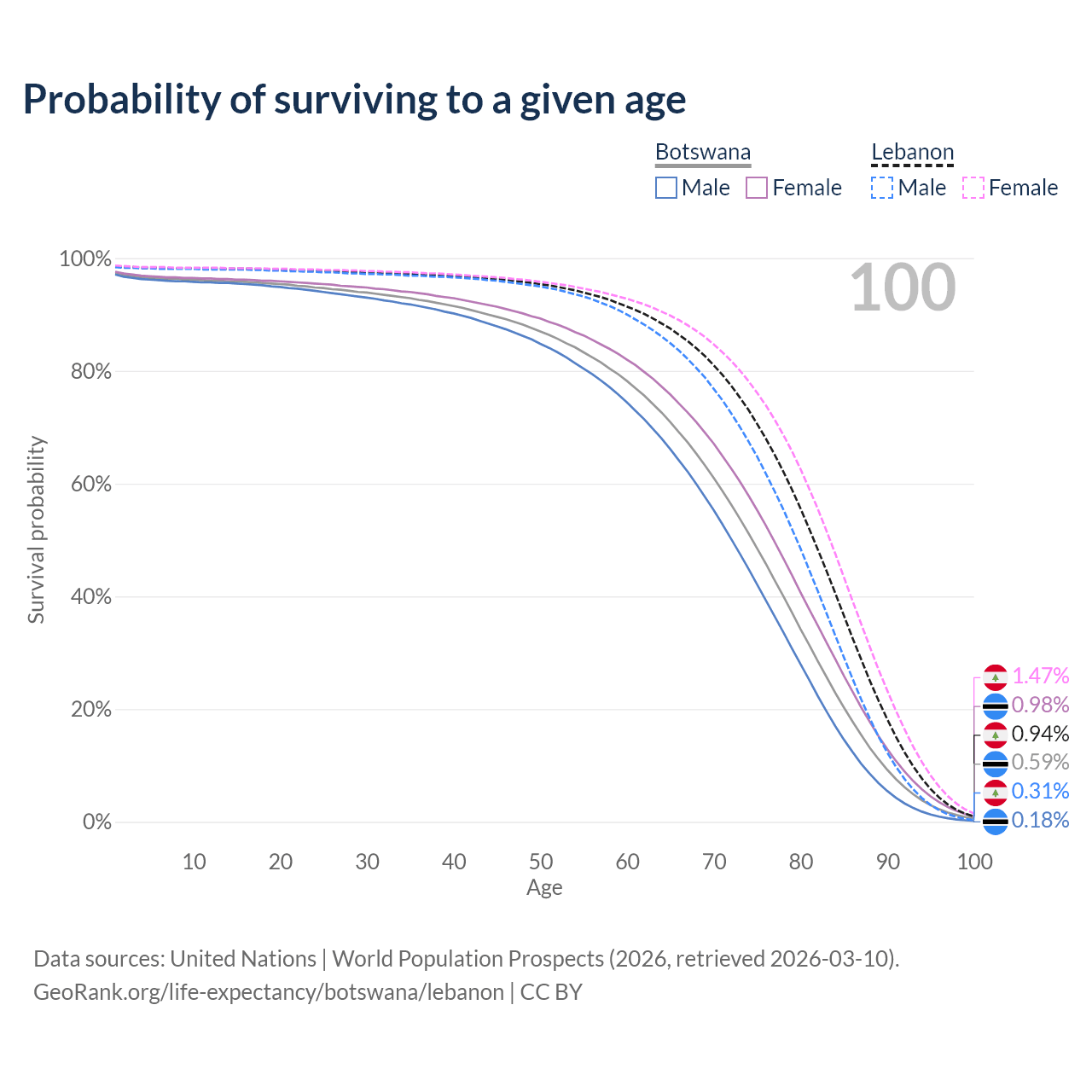 This life expectancy calculator shows the odds of living to 100, 95, 90, and below based on current age for both males and females in Botswana and Lebanon, along with mean and median age of death. The calculations are based on the 2026 life tables (actuarial tables) from the UN World Population Prospects.