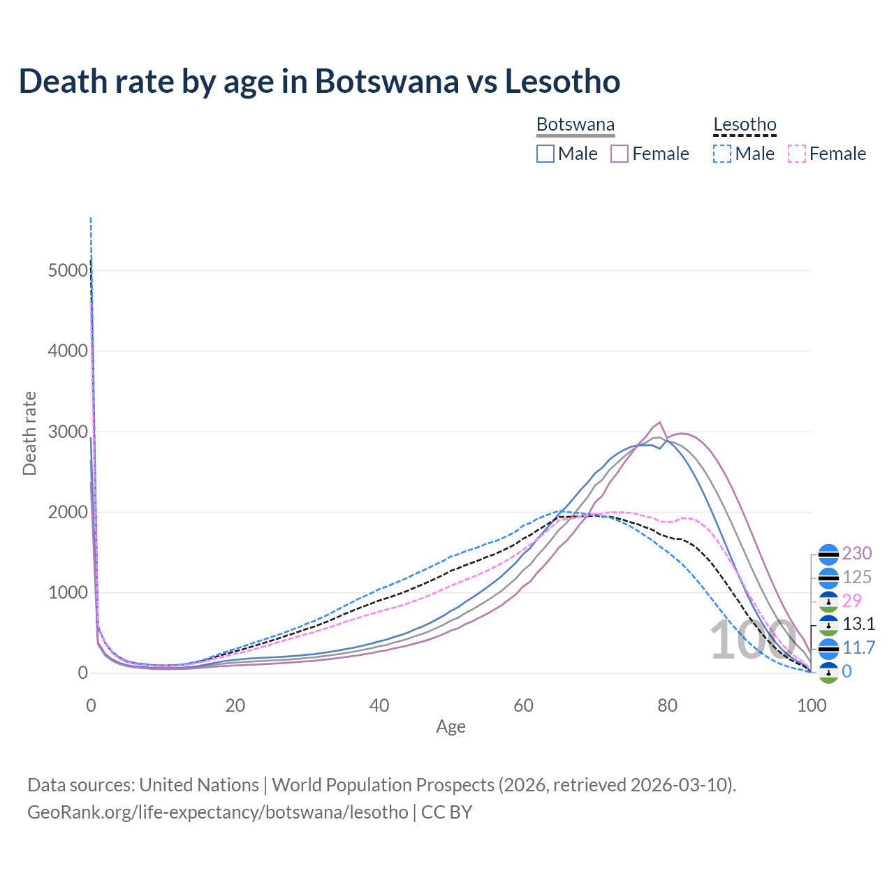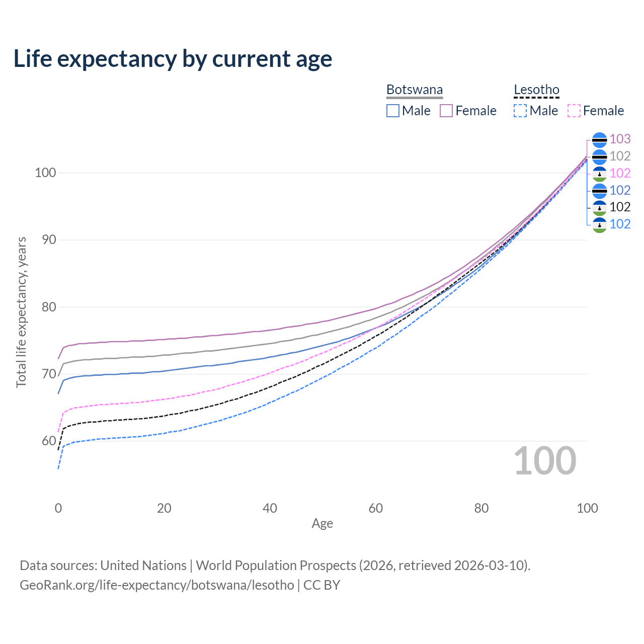 This life expectancy calculator shows the odds of living to 100, 95, 90, and below based on current age for both males and females in Botswana and Lesotho, along with mean and median age of death. The calculations are based on the 2026 life tables (actuarial tables) from the UN World Population Prospects.