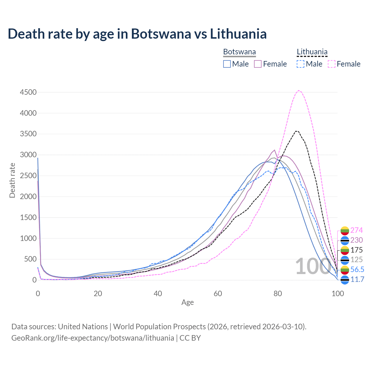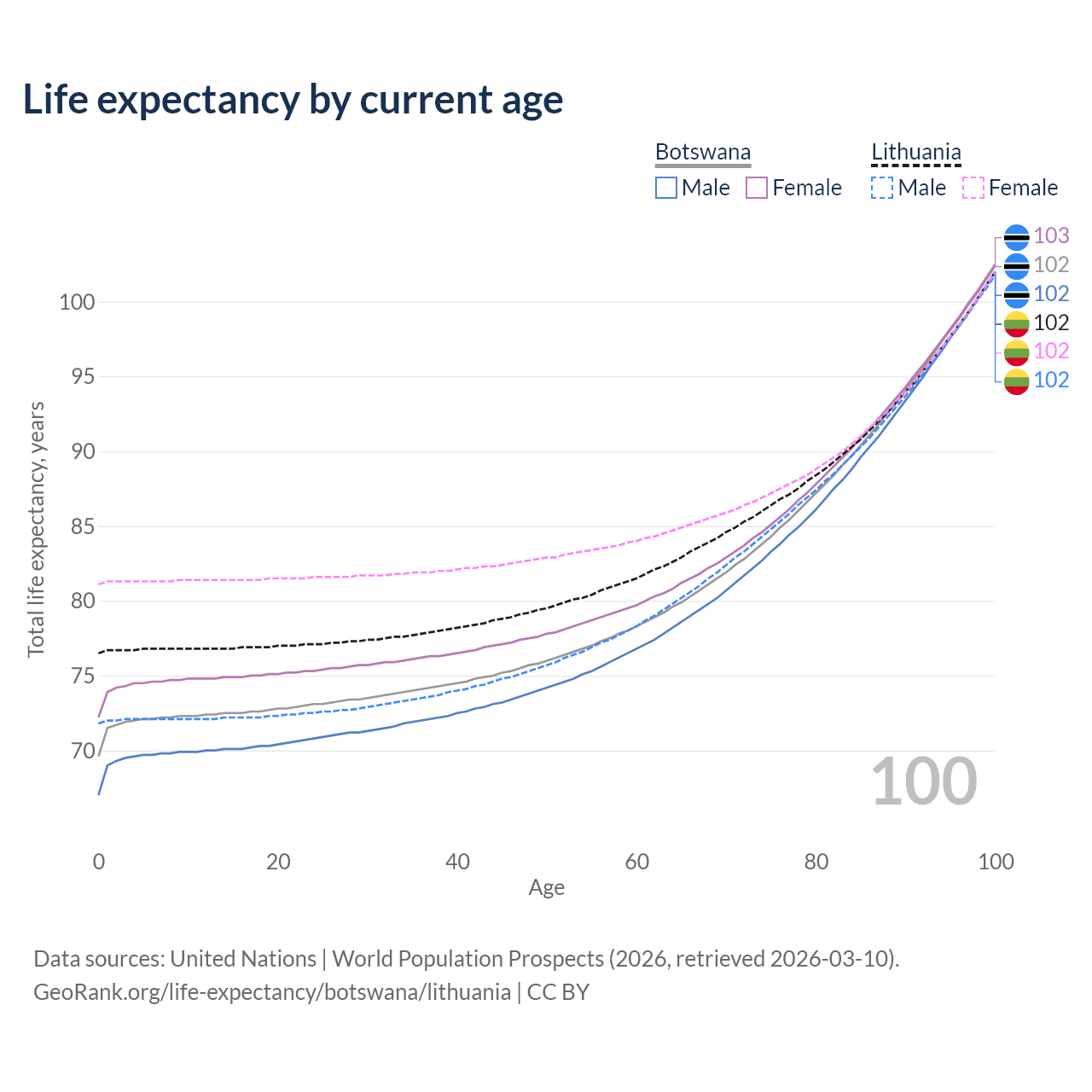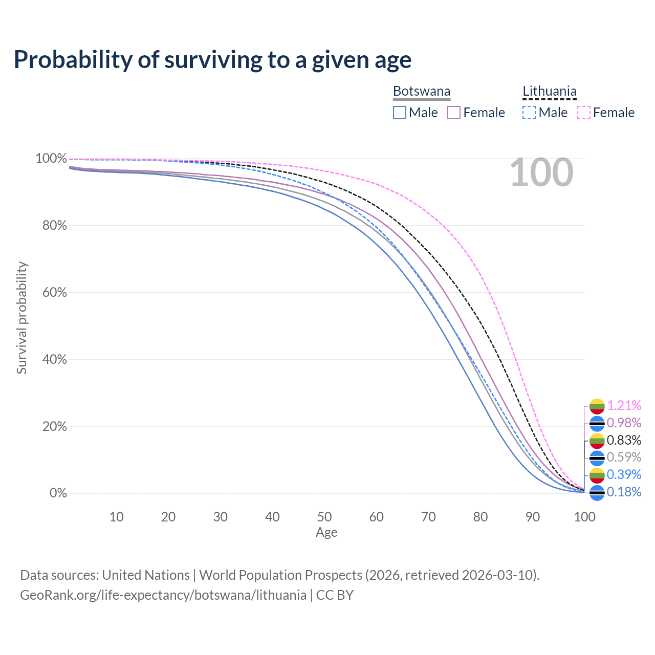 This life expectancy calculator shows the odds of living to 100, 95, 90, and below based on current age for both males and females in Botswana and Lithuania, along with mean and median age of death. The calculations are based on the 2026 life tables (actuarial tables) from the UN World Population Prospects.