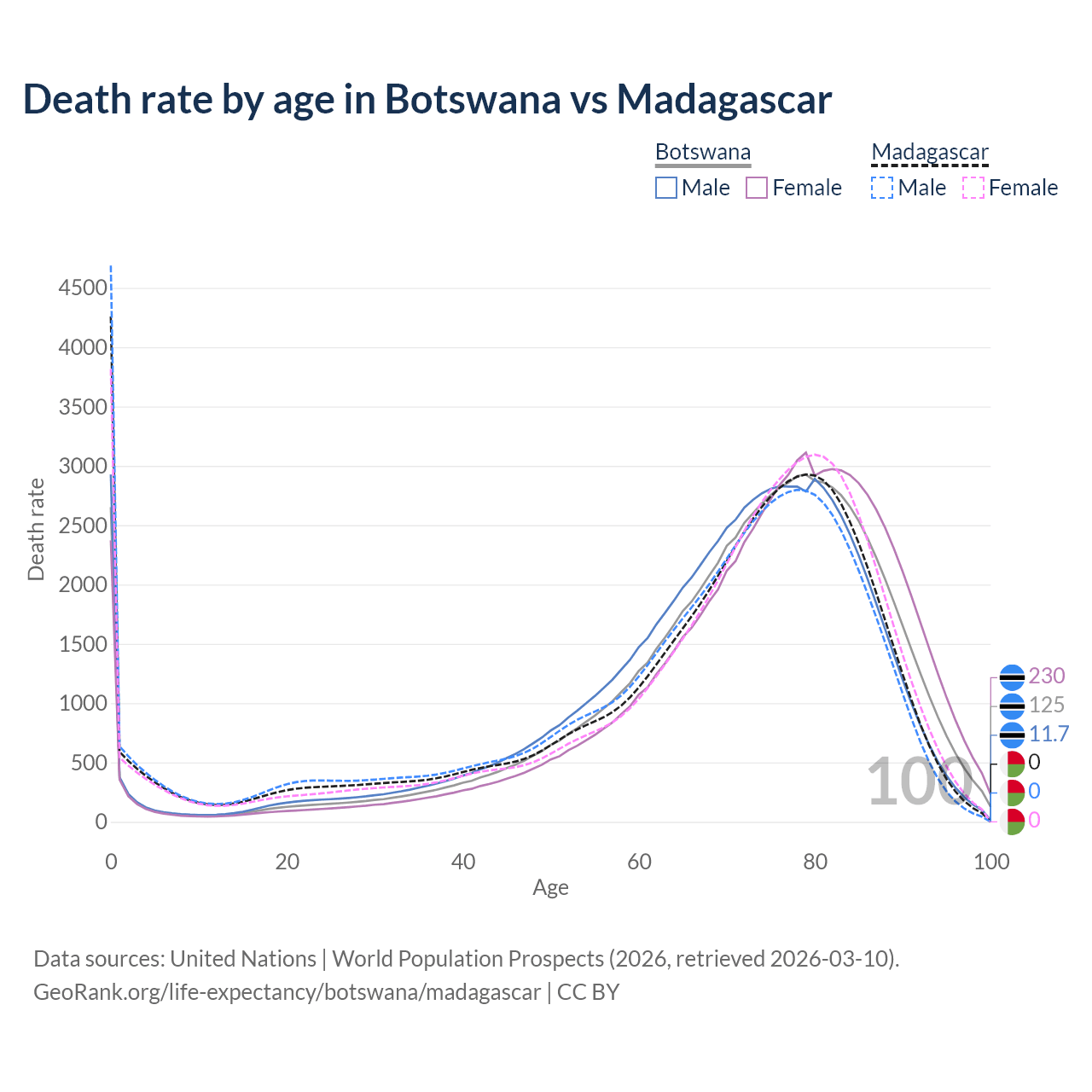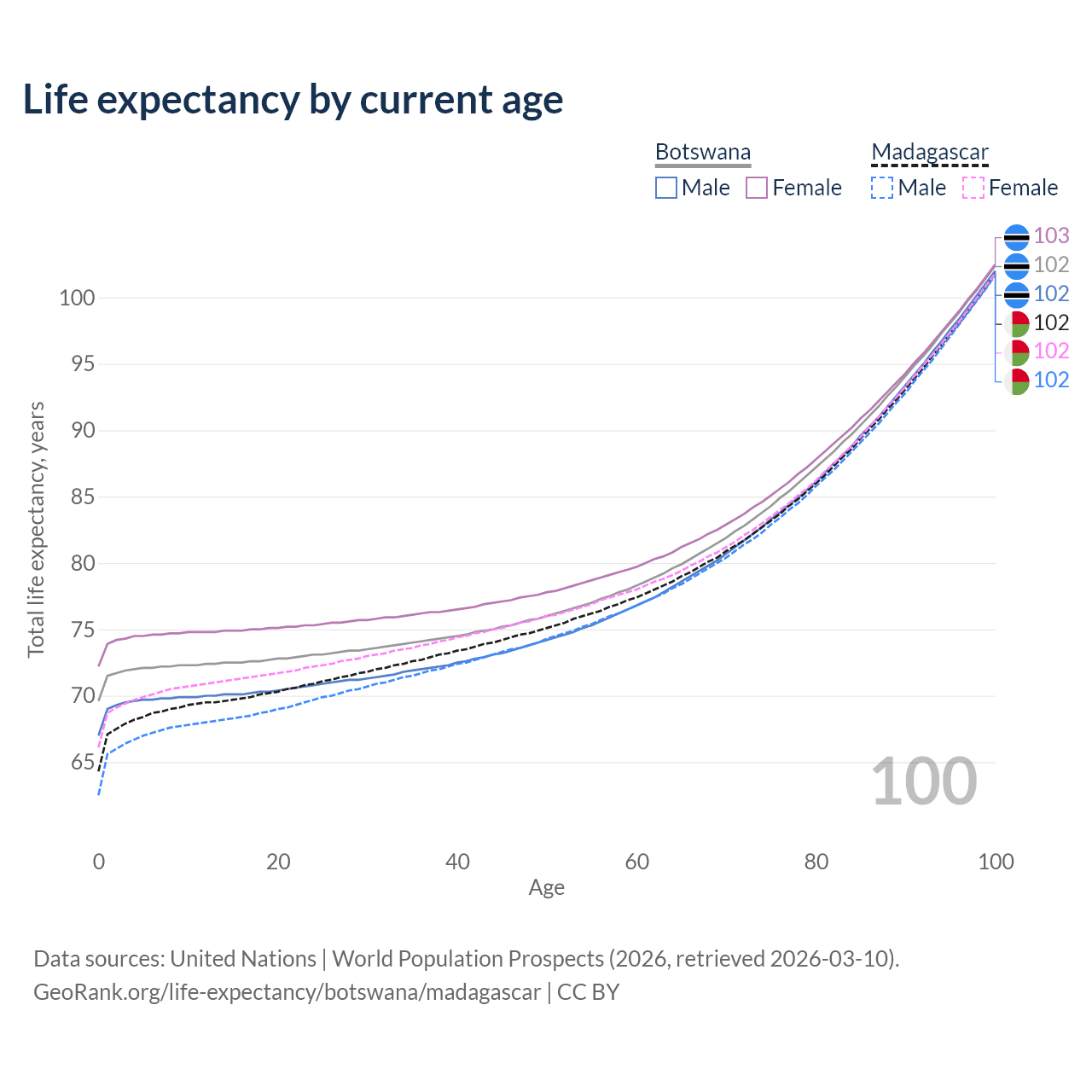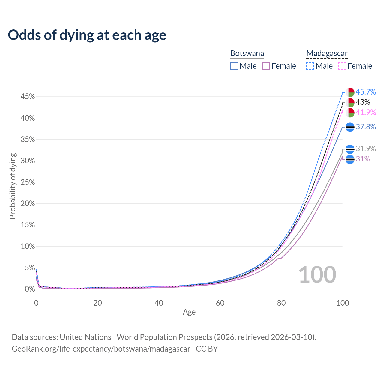 This life expectancy calculator shows the odds of living to 100, 95, 90, and below based on current age for both males and females in Botswana and Madagascar, along with mean and median age of death. The calculations are based on the 2026 life tables (actuarial tables) from the UN World Population Prospects.