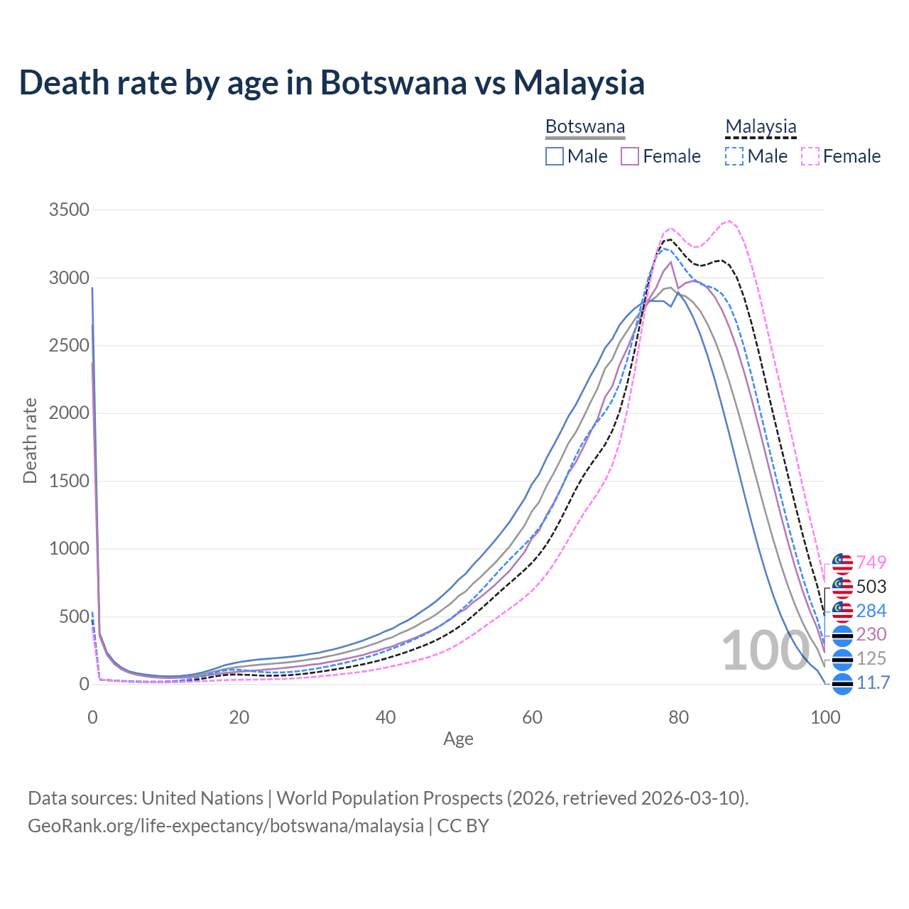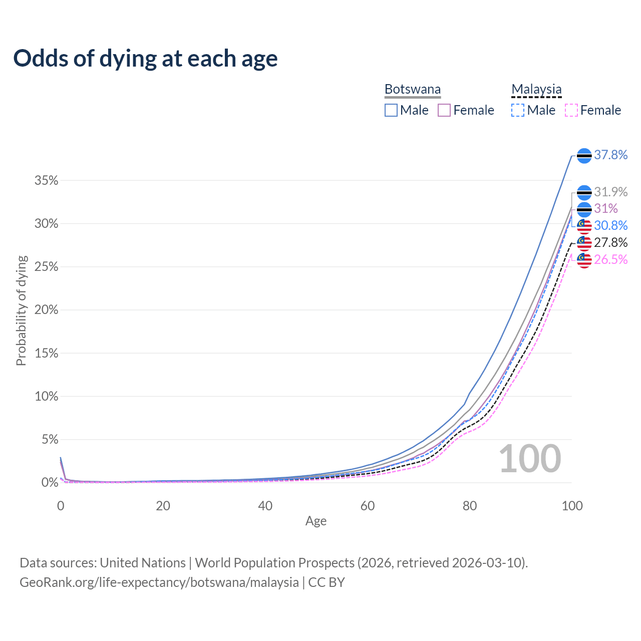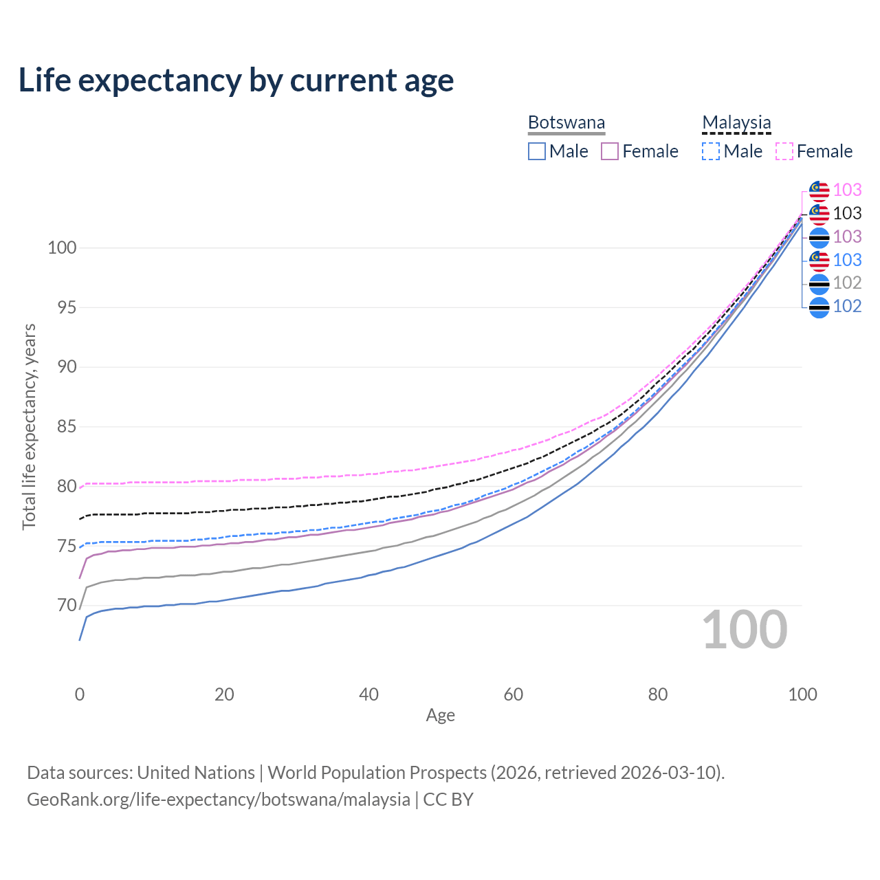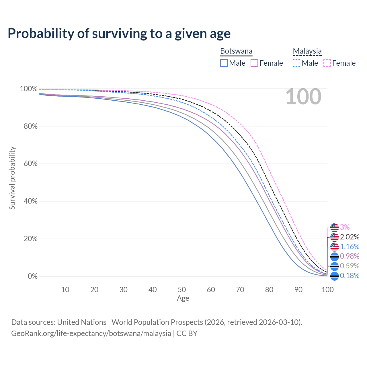 This life expectancy calculator shows the odds of living to 100, 95, 90, and below based on current age for both males and females in Botswana and Malaysia, along with mean and median age of death. The calculations are based on the 2026 life tables (actuarial tables) from the UN World Population Prospects.