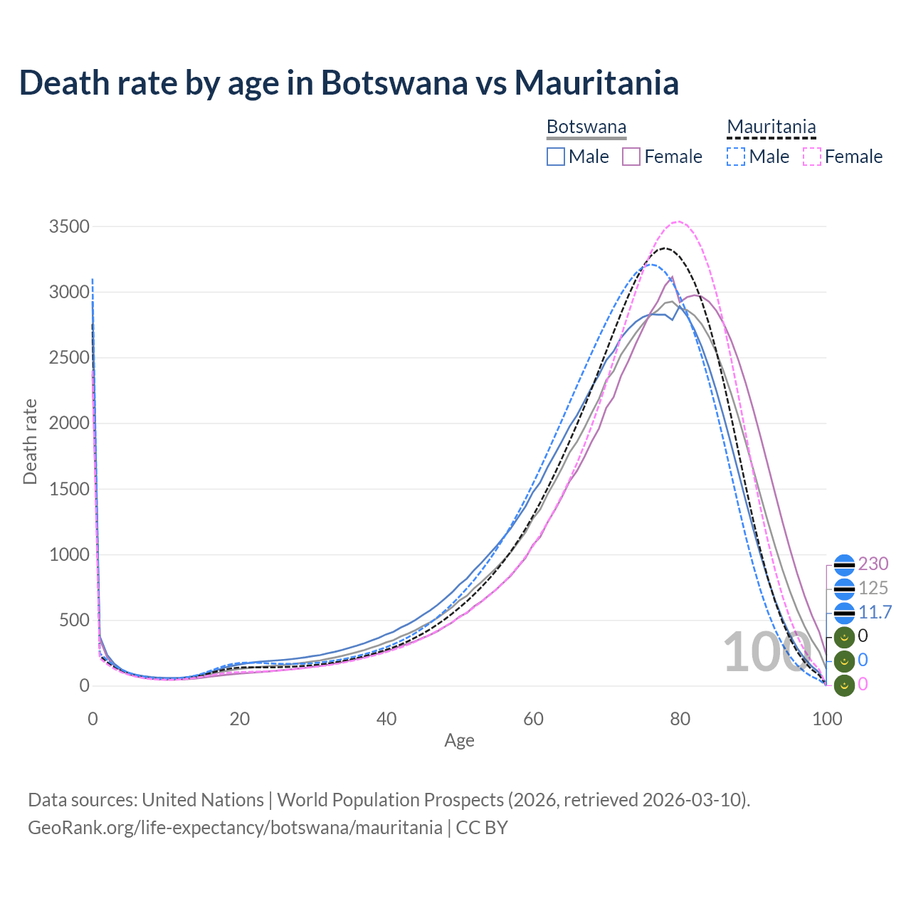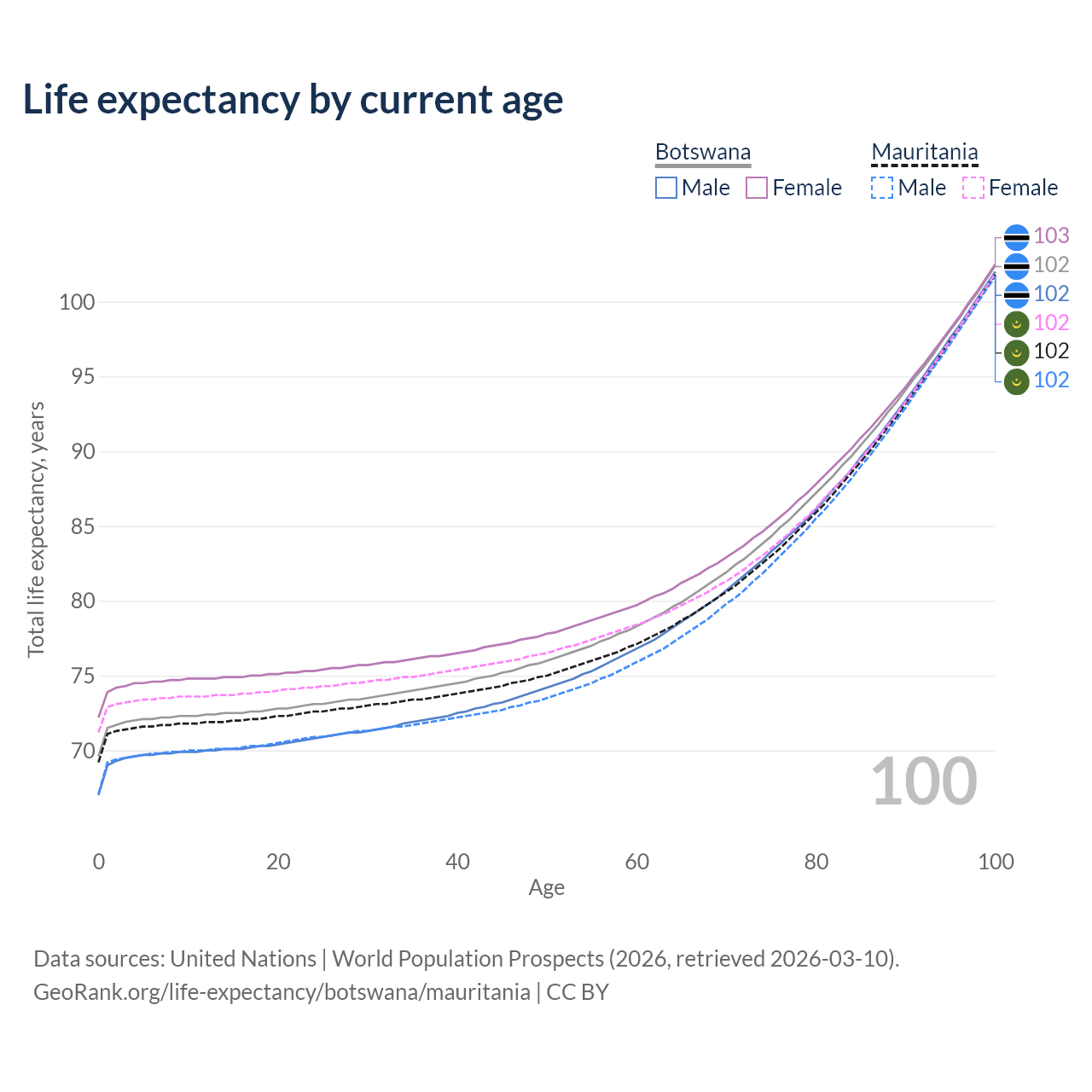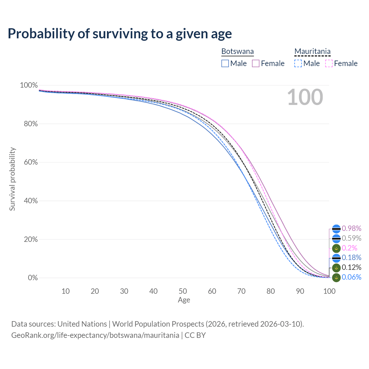 This life expectancy calculator shows the odds of living to 100, 95, 90, and below based on current age for both males and females in Botswana and Mauritania, along with mean and median age of death. The calculations are based on the 2026 life tables (actuarial tables) from the UN World Population Prospects.