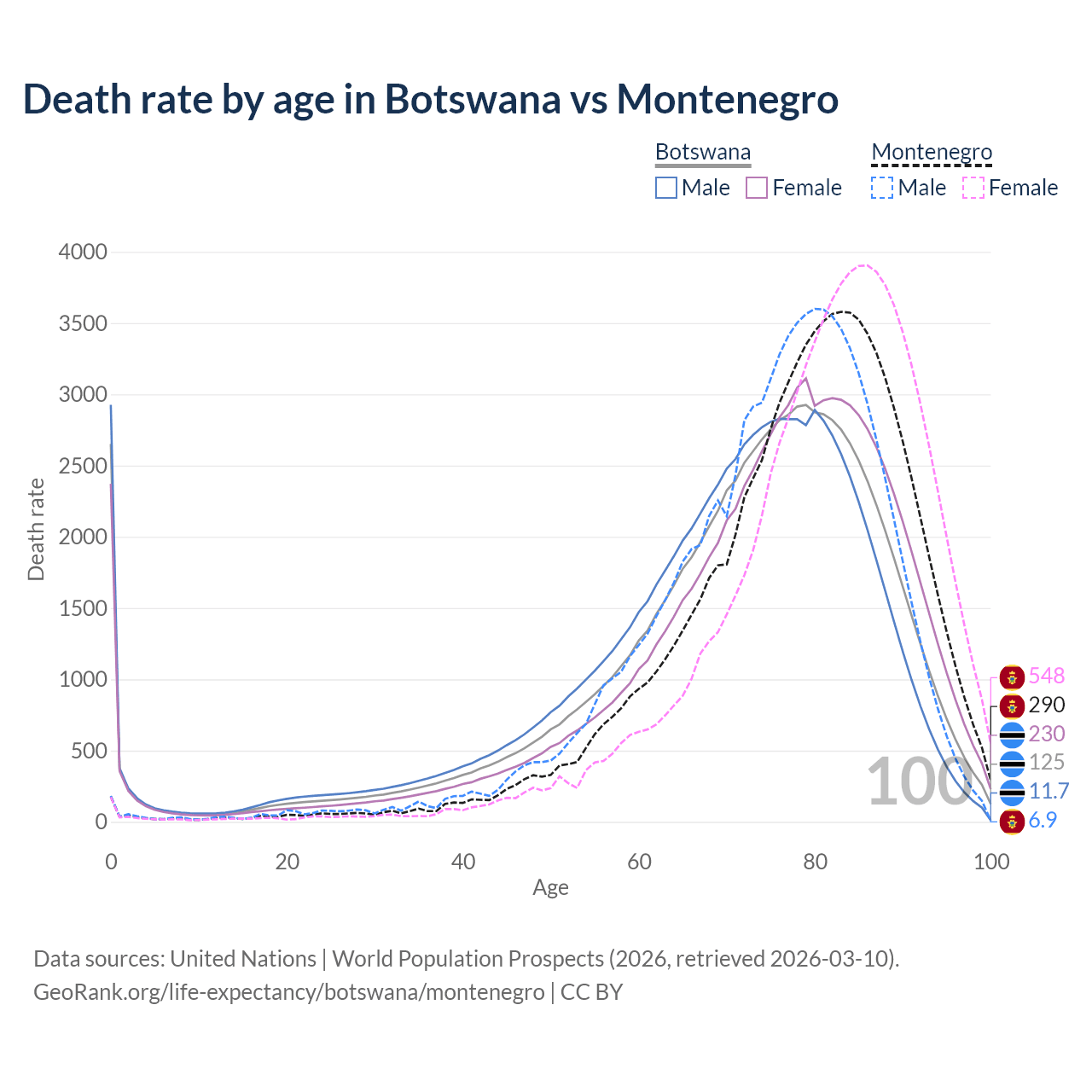In Botswana, the most common age of death is 79, compared to 83 in Montenegro. The median age of death is 74.4 in Botswana and 80.1 in Montenegro, meaning only half of each cohort is expected to live past that age.