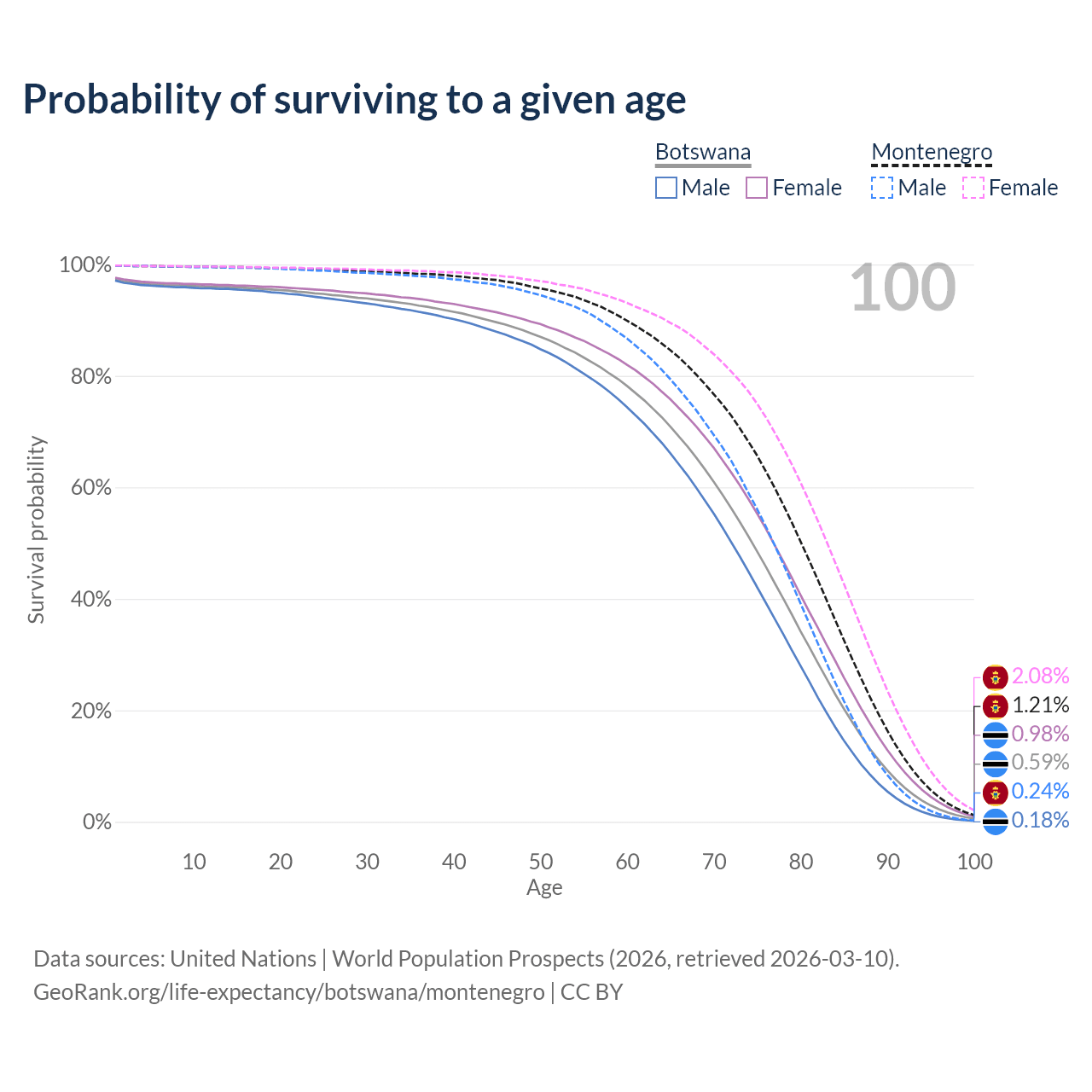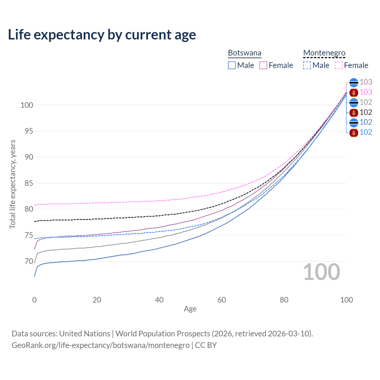 This life expectancy calculator shows the odds of living to 100, 95, 90, and below based on current age for both males and females in Botswana and Montenegro, along with mean and median age of death. The calculations are based on the 2026 life tables (actuarial tables) from the UN World Population Prospects.