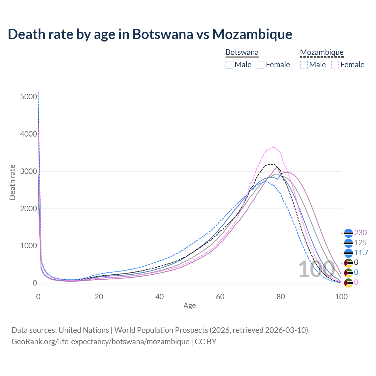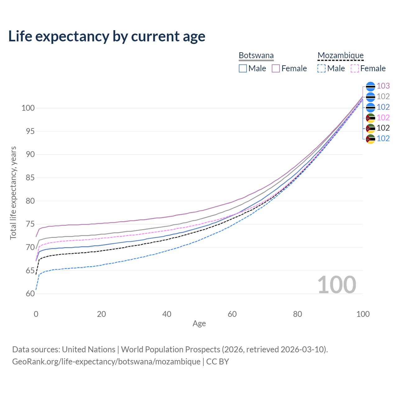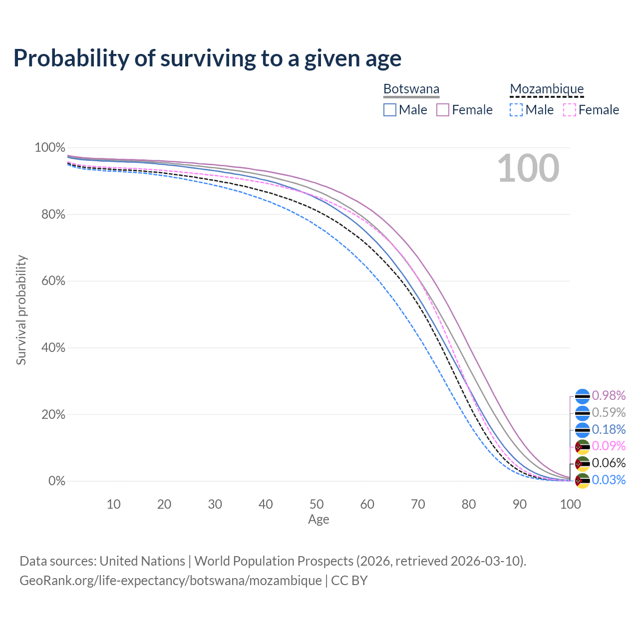 This life expectancy calculator shows the odds of living to 100, 95, 90, and below based on current age for both males and females in Botswana and Mozambique, along with mean and median age of death. The calculations are based on the 2026 life tables (actuarial tables) from the UN World Population Prospects.