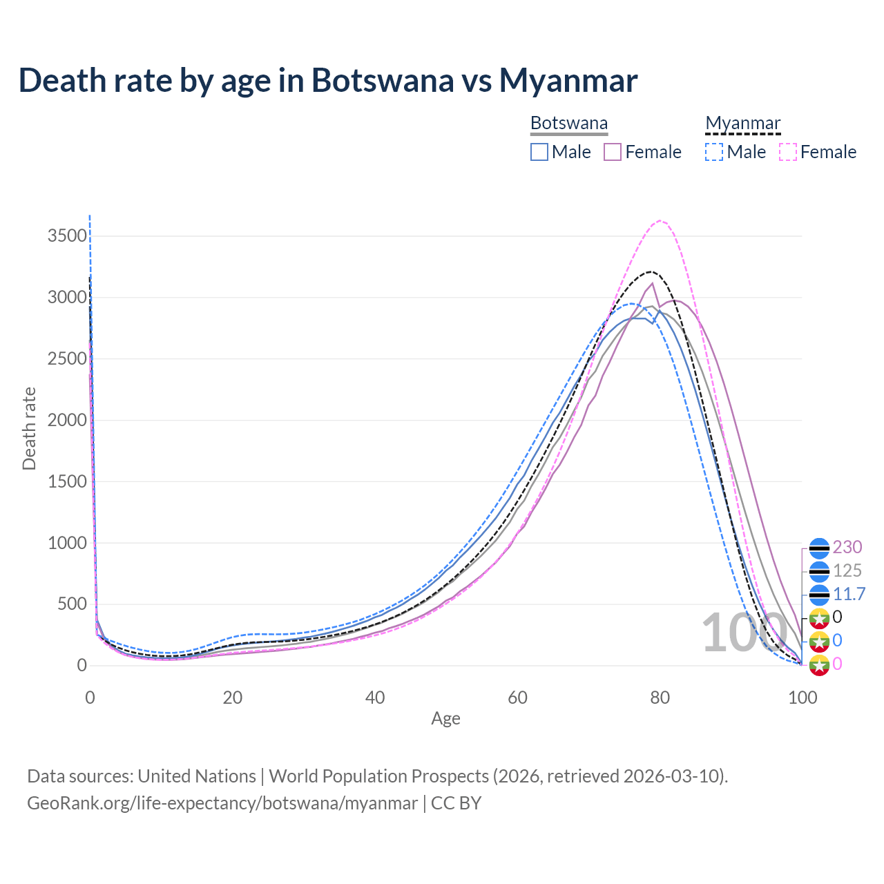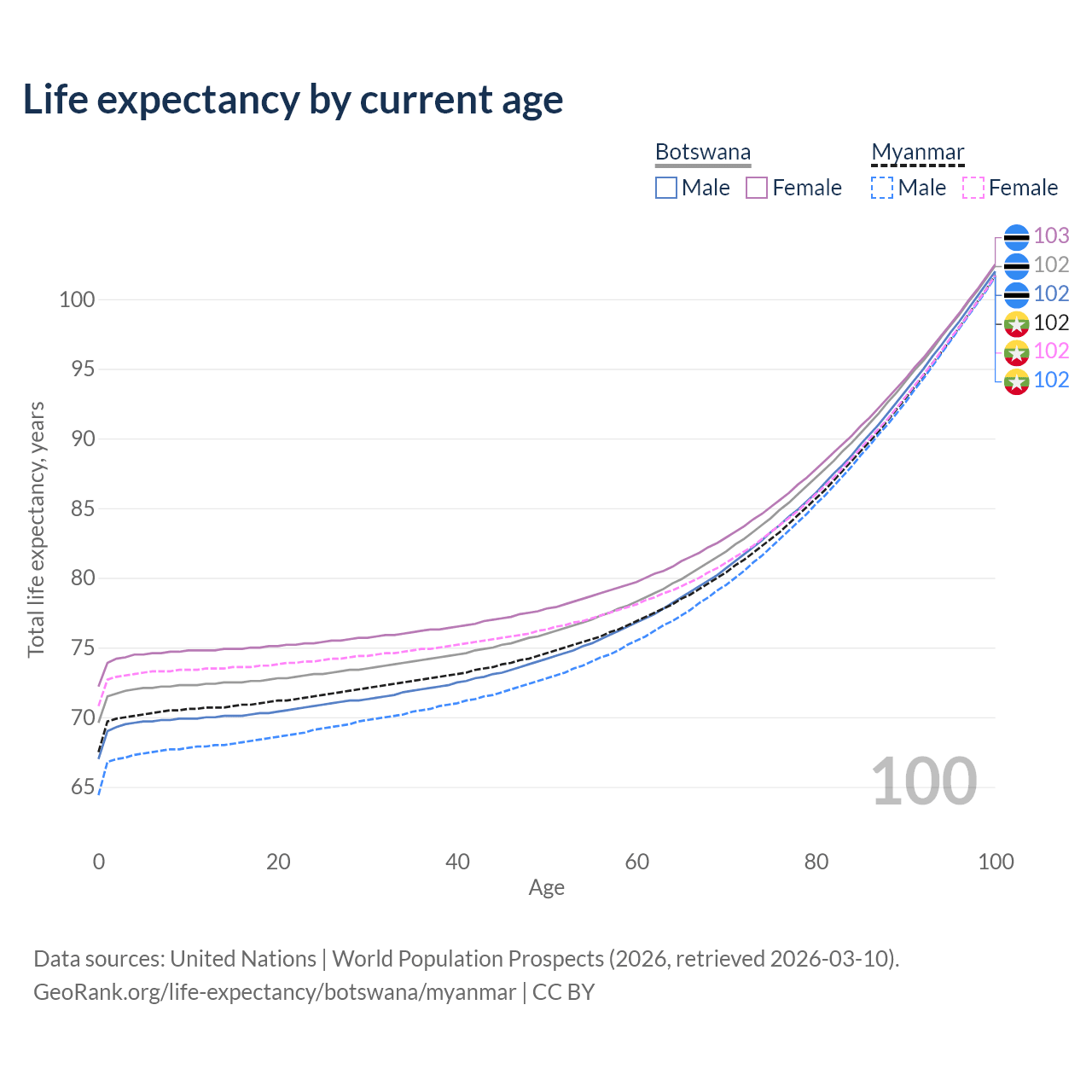 The average life expectancy at birth is 69.6 years in Botswana vs 67.5 in Myanmar. Botswana is ranked 141/197 by life expectancy, and Myanmar is 157/197. In Botswana, the life expectancy is 67 years for males and 72.2 years for females. In Myanmar, it's 64.4 years for males and 70.8 years for females.