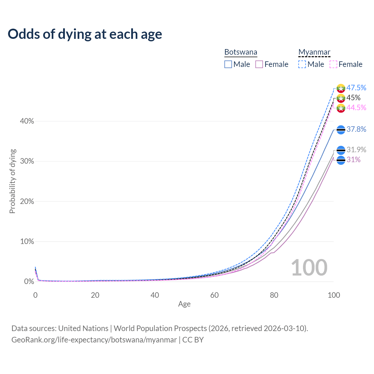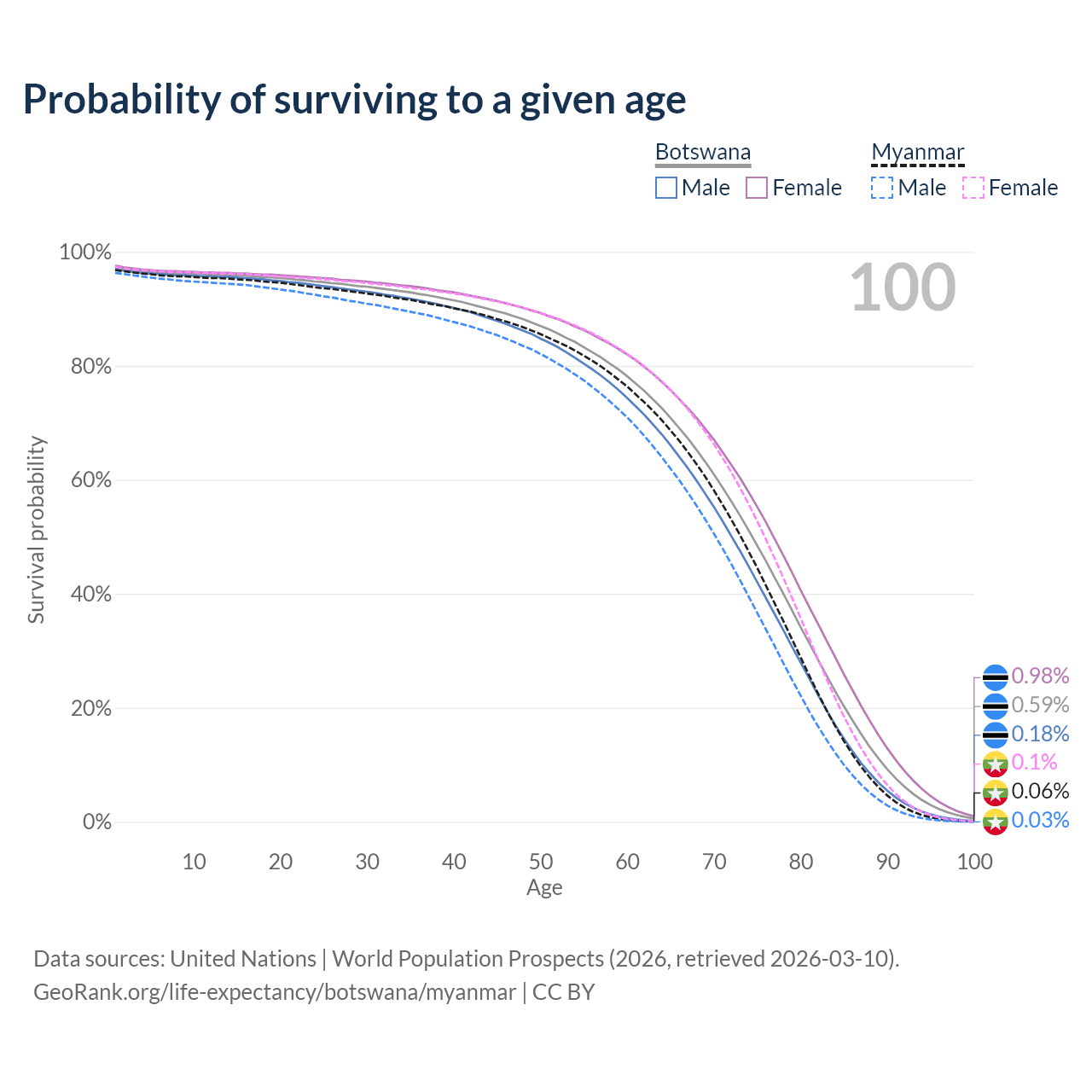 This life expectancy calculator shows the odds of living to 100, 95, 90, and below based on current age for both males and females in Botswana and Myanmar, along with mean and median age of death. The calculations are based on the 2026 life tables (actuarial tables) from the UN World Population Prospects.