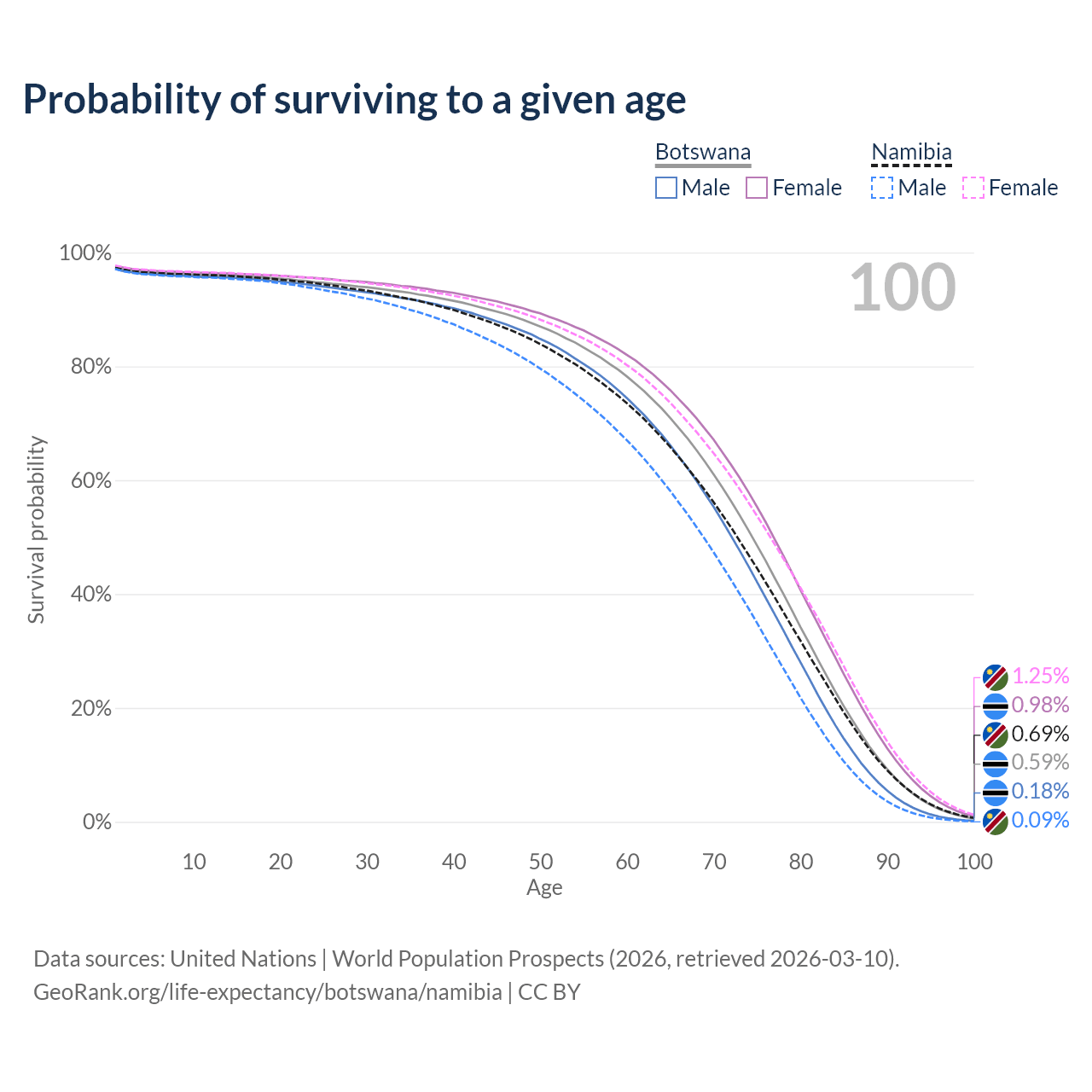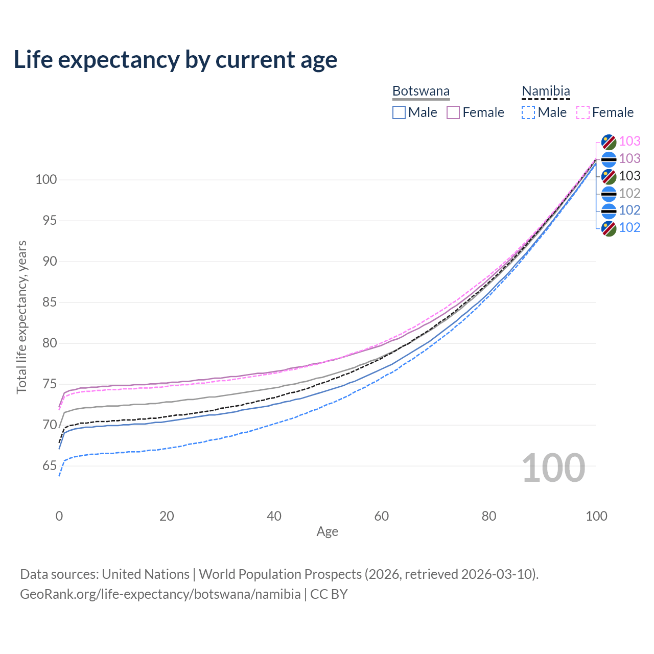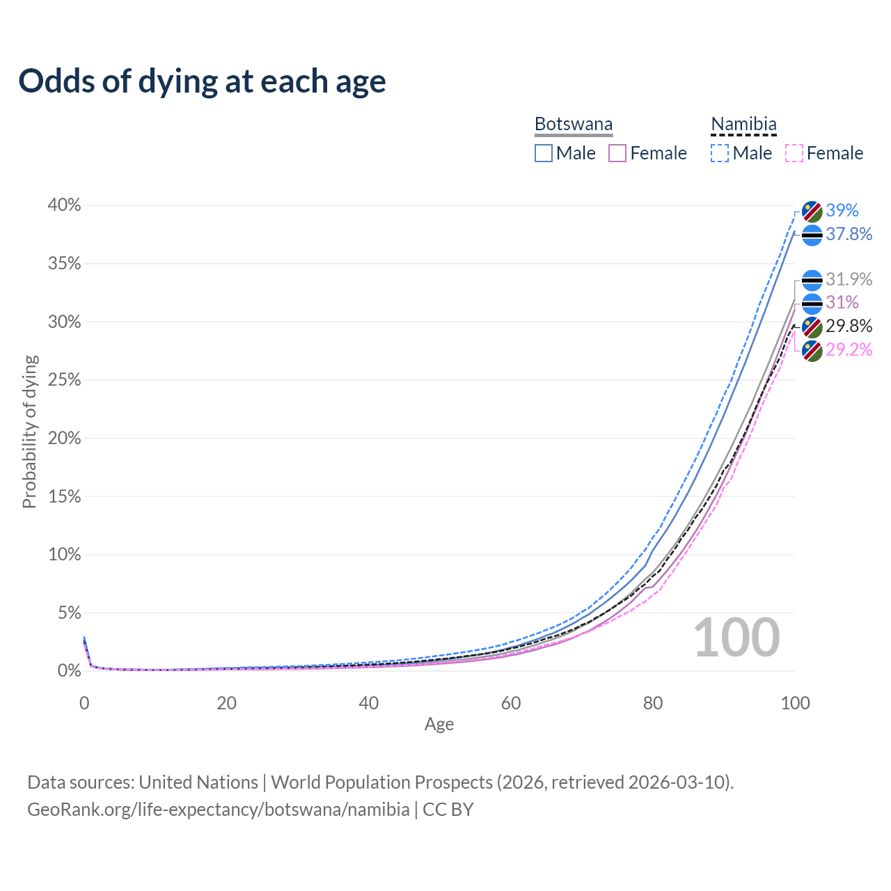 This life expectancy calculator shows the odds of living to 100, 95, 90, and below based on current age for both males and females in Botswana and Namibia, along with mean and median age of death. The calculations are based on the 2026 life tables (actuarial tables) from the UN World Population Prospects.