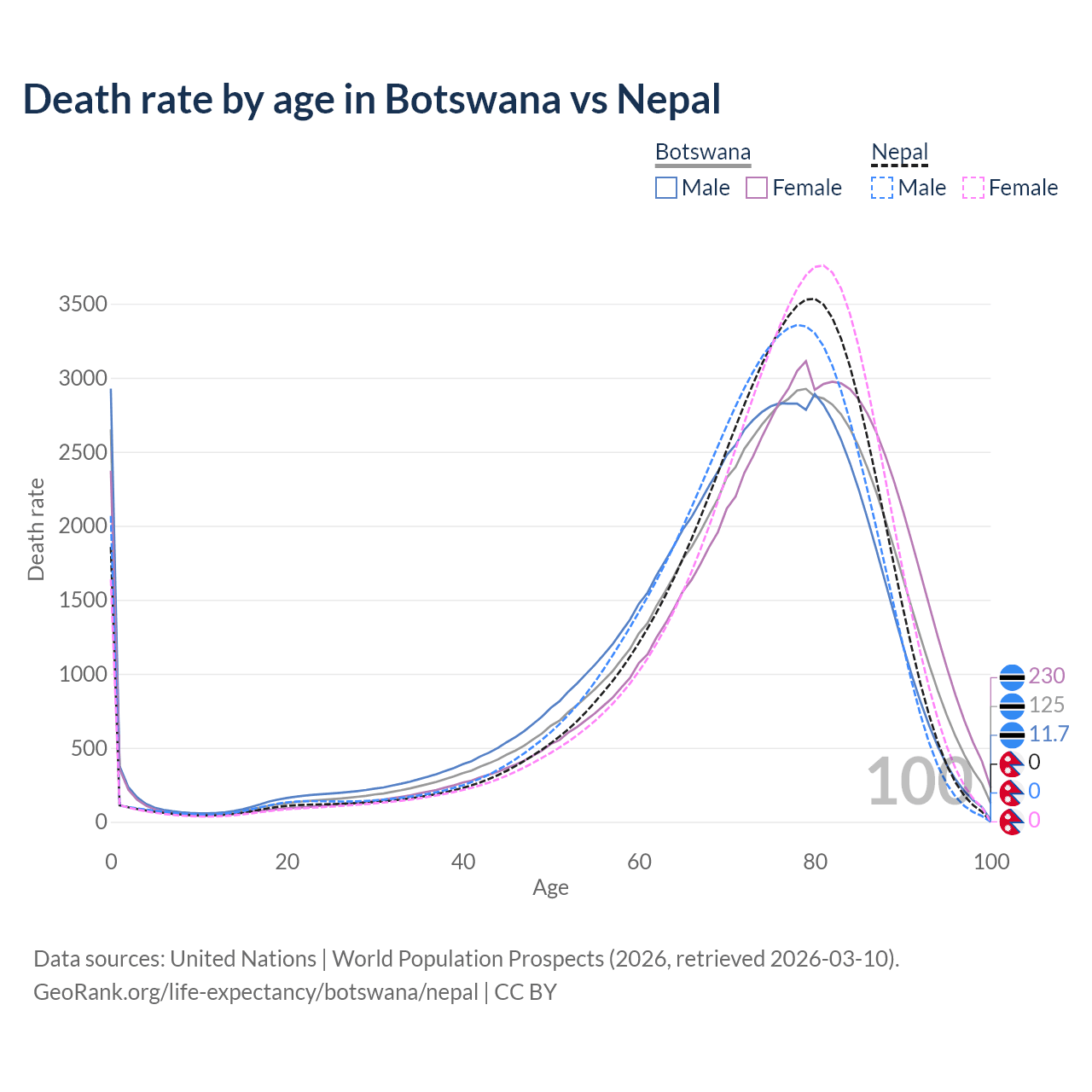 In Botswana, the most common age of death is 79, compared to 80 in Nepal. The median age of death is 74.4 in Botswana and 75.4 in Nepal, meaning only half of each cohort is expected to live past that age.