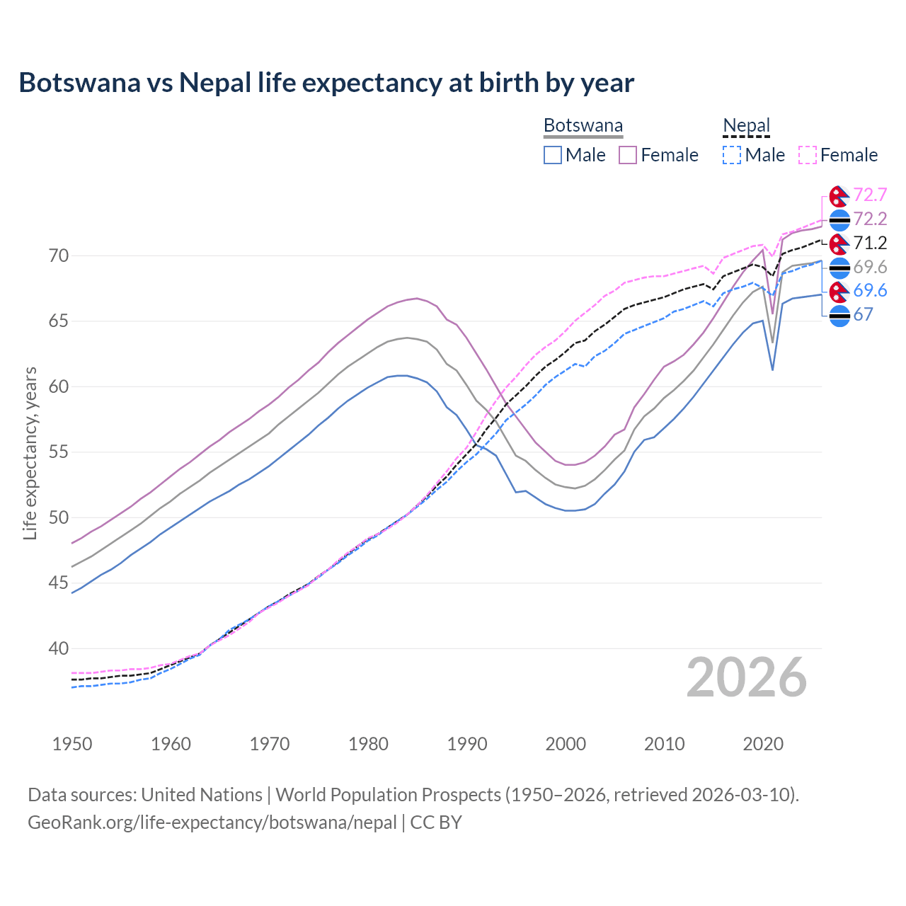 The average life expectancy at birth is 69.6 years in Botswana vs 71.2 in Nepal. Botswana is ranked 141/197 by life expectancy, and Nepal is 131/197. In Botswana, the life expectancy is 67 years for males and 72.2 years for females. In Nepal, it's 69.6 years for males and 72.7 years for females.