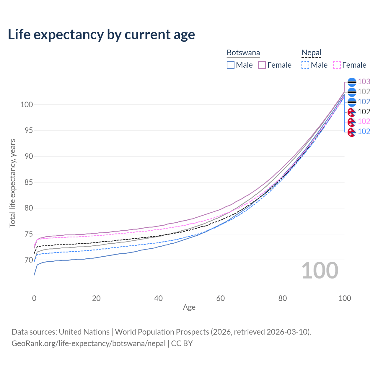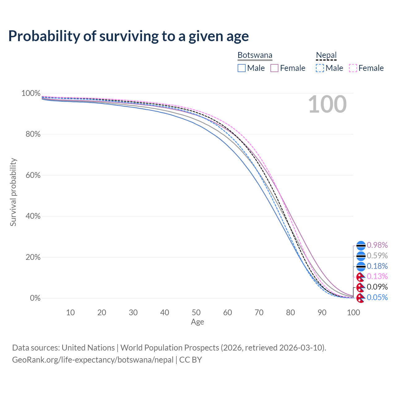 This life expectancy calculator shows the odds of living to 100, 95, 90, and below based on current age for both males and females in Botswana and Nepal, along with mean and median age of death. The calculations are based on the 2026 life tables (actuarial tables) from the UN World Population Prospects.