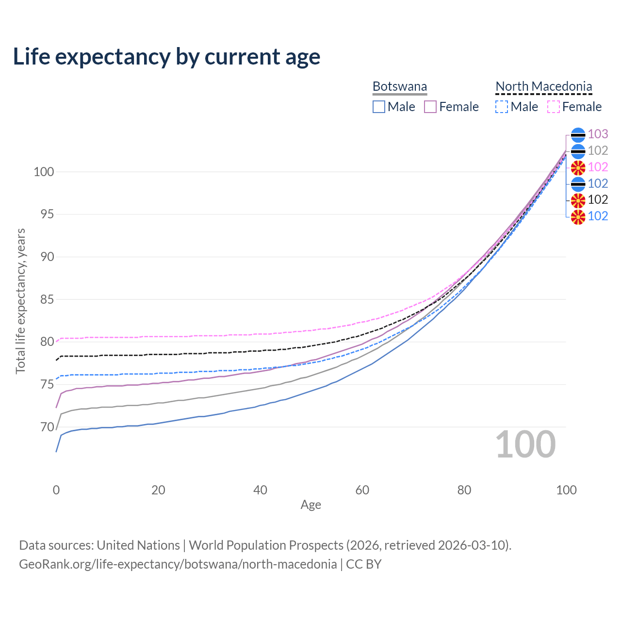 This life expectancy calculator shows the odds of living to 100, 95, 90, and below based on current age for both males and females in Botswana and North Macedonia, along with mean and median age of death. The calculations are based on the 2026 life tables (actuarial tables) from the UN World Population Prospects.