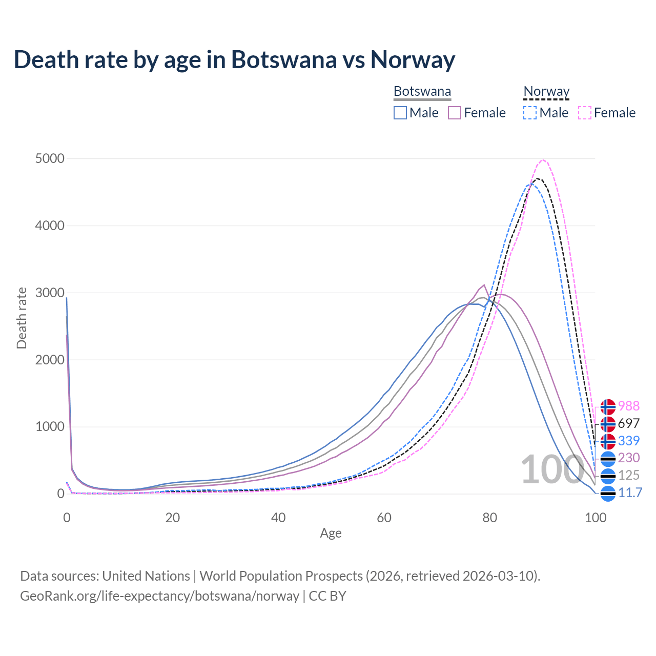In Botswana, the most common age of death is 79, compared to 89 in Norway. The median age of death is 74.4 in Botswana and 86.5 in Norway, meaning only half of each cohort is expected to live past that age.