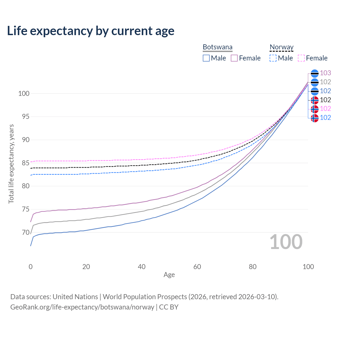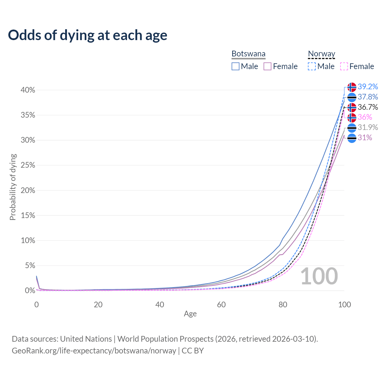 This life expectancy calculator shows the odds of living to 100, 95, 90, and below based on current age for both males and females in Botswana and Norway, along with mean and median age of death. The calculations are based on the 2026 life tables (actuarial tables) from the UN World Population Prospects.