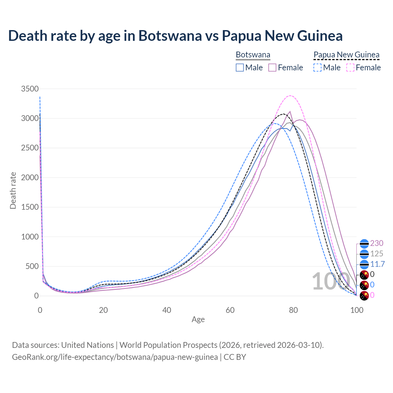 In Botswana, the most common age of death is 79, compared to 0 in Papua New Guinea. The median age of death is 74.4 in Botswana and 71.7 in Papua New Guinea, meaning only half of each cohort is expected to live past that age.
