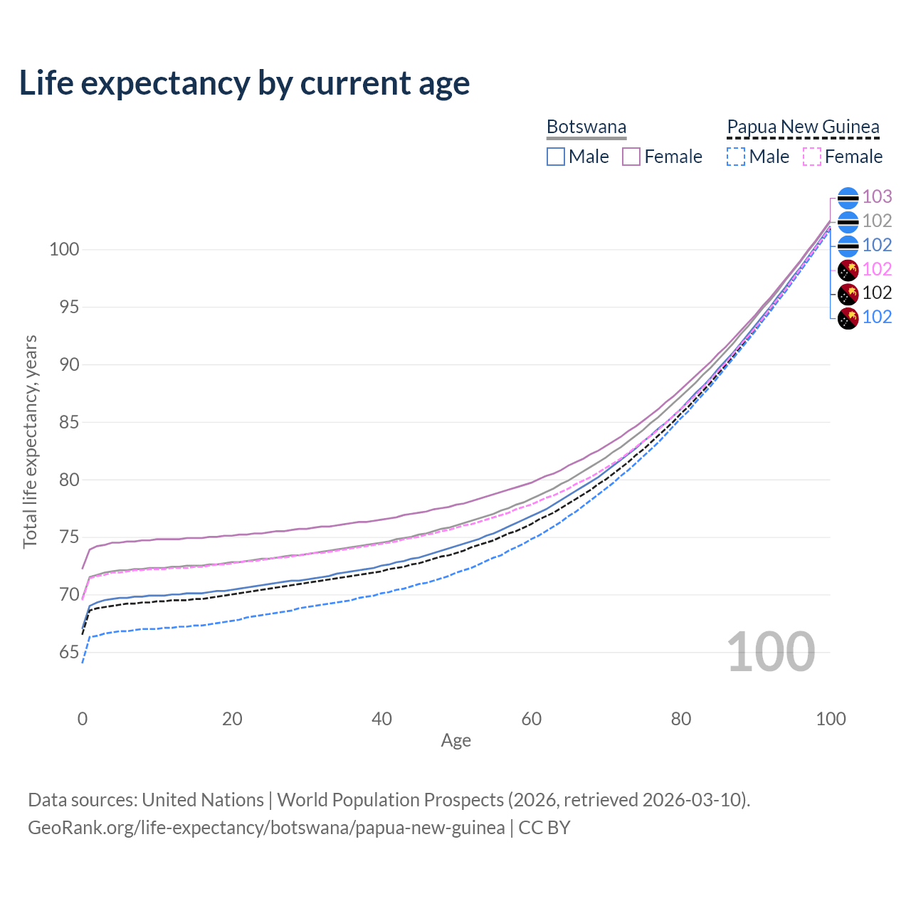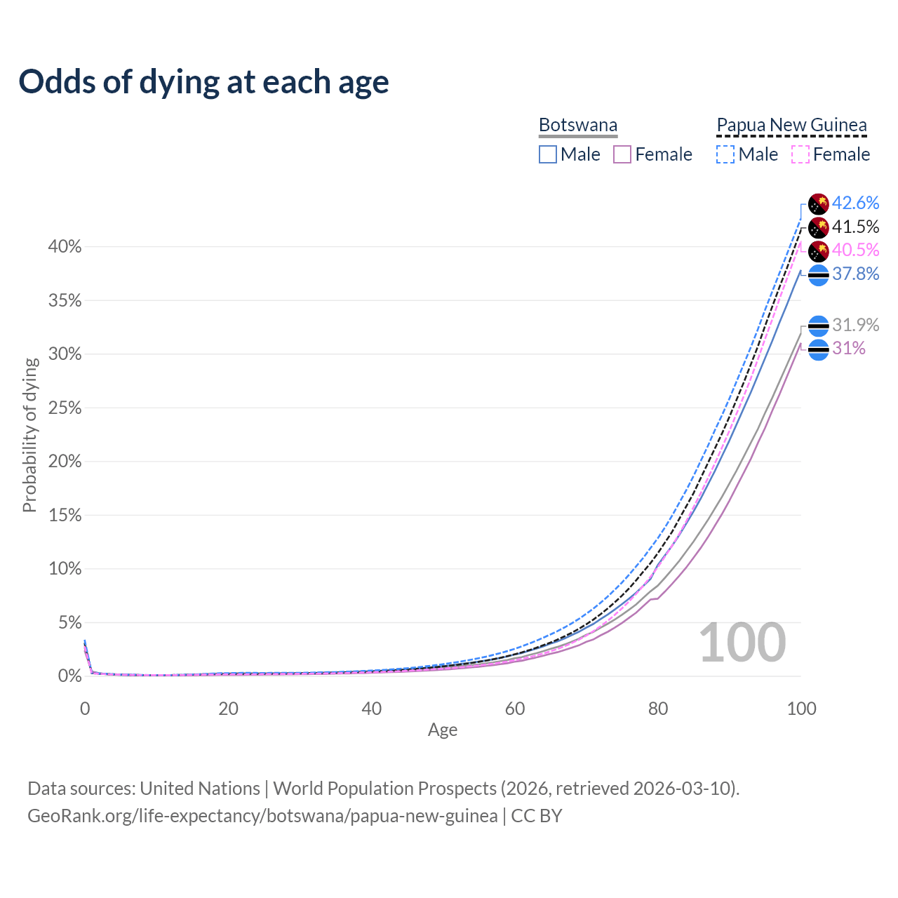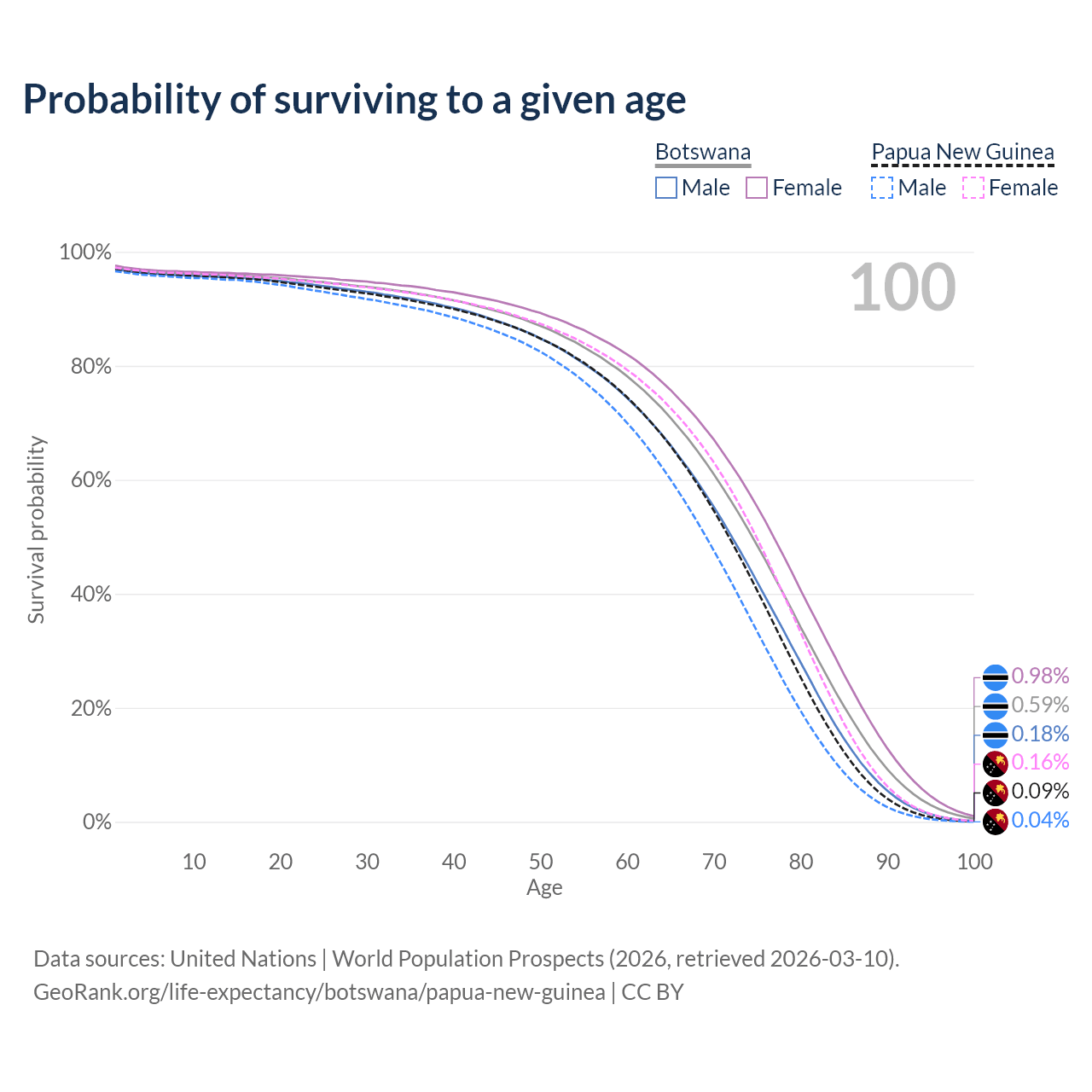 This life expectancy calculator shows the odds of living to 100, 95, 90, and below based on current age for both males and females in Botswana and Papua New Guinea, along with mean and median age of death. The calculations are based on the 2026 life tables (actuarial tables) from the UN World Population Prospects.