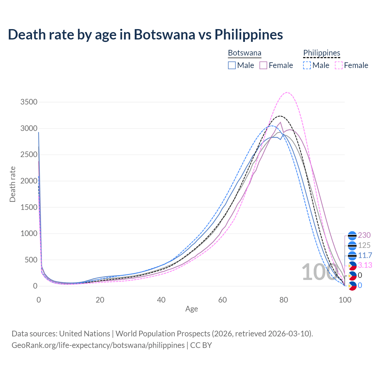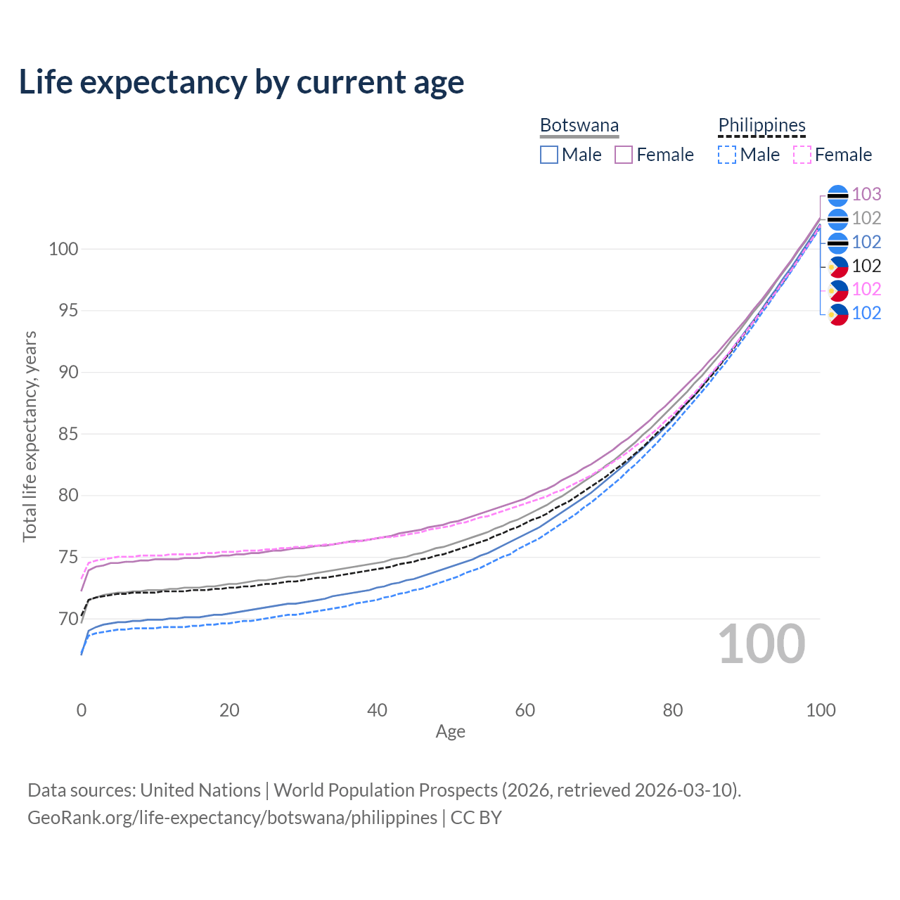 This life expectancy calculator shows the odds of living to 100, 95, 90, and below based on current age for both males and females in Botswana and the Philippines, along with mean and median age of death. The calculations are based on the 2026 life tables (actuarial tables) from the UN World Population Prospects.