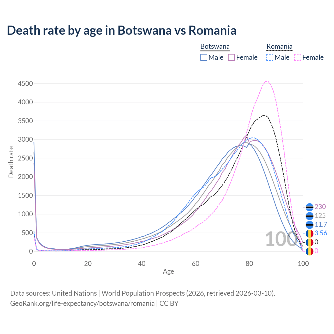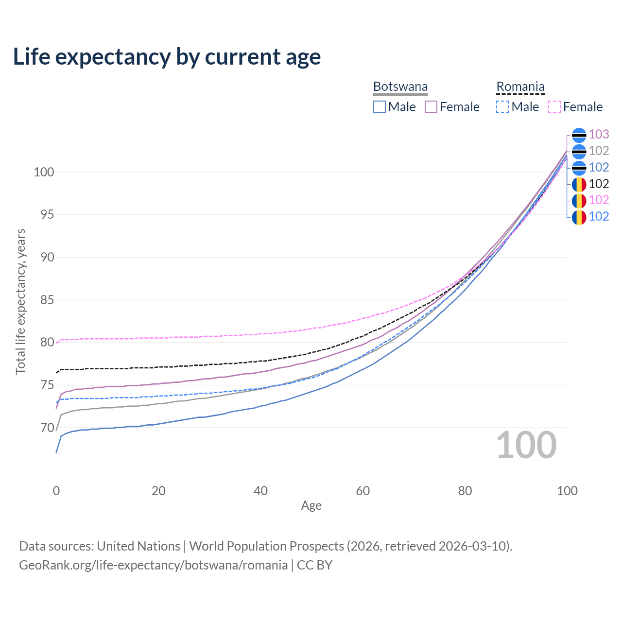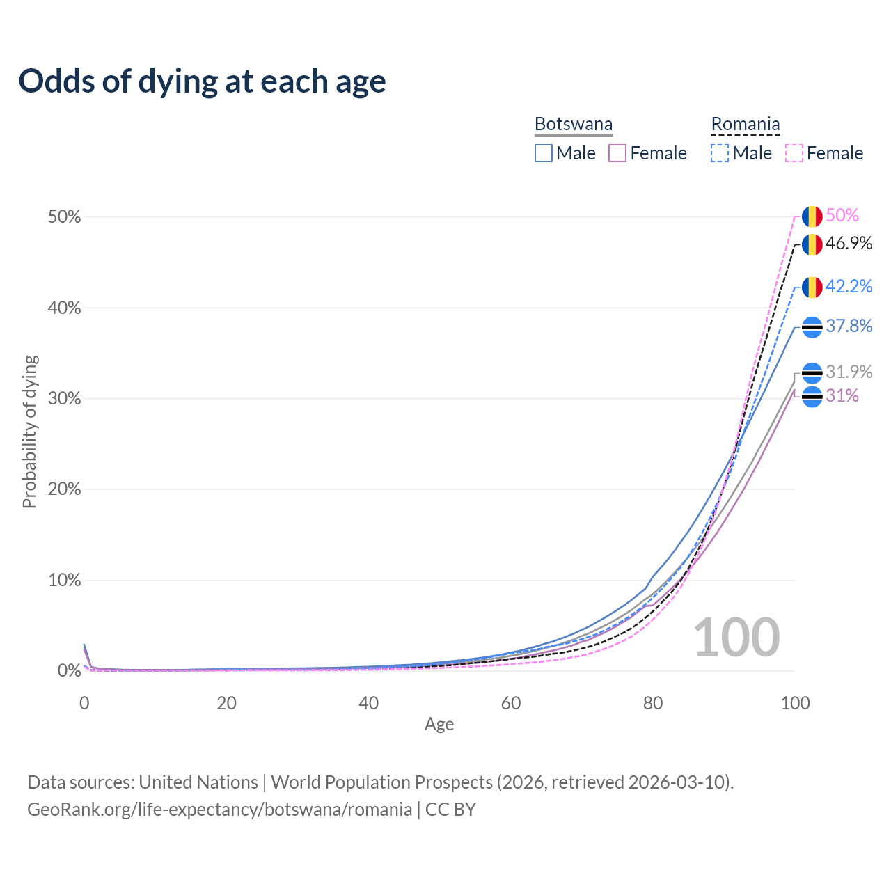 This life expectancy calculator shows the odds of living to 100, 95, 90, and below based on current age for both males and females in Botswana and Romania, along with mean and median age of death. The calculations are based on the 2026 life tables (actuarial tables) from the UN World Population Prospects.