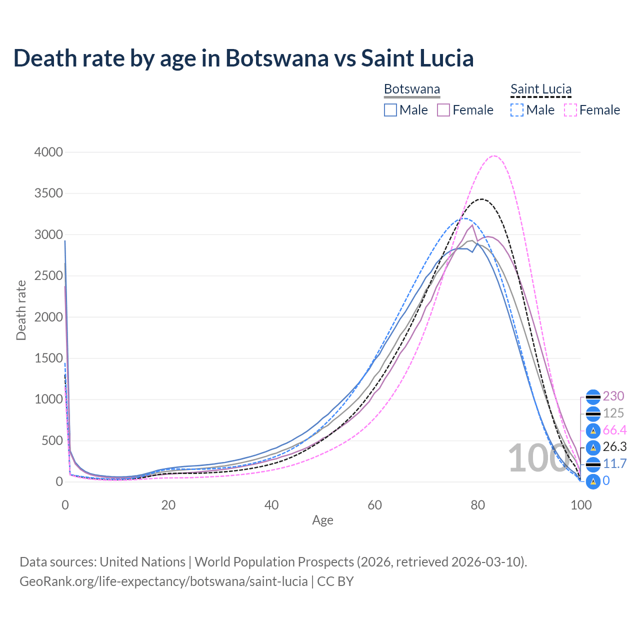 In Botswana, the most common age of death is 79, compared to 81 in Saint Lucia. The median age of death is 74.4 in Botswana and 76.8 in Saint Lucia, meaning only half of each cohort is expected to live past that age.