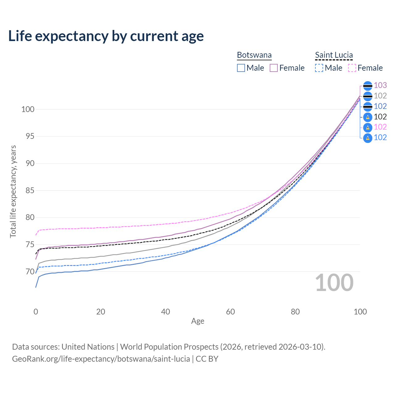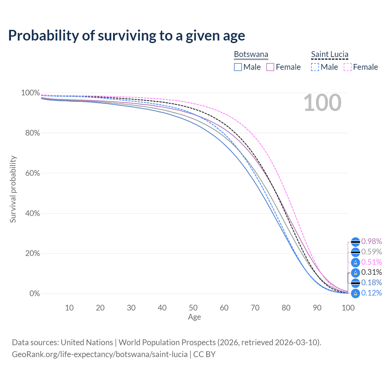 This life expectancy calculator shows the odds of living to 100, 95, 90, and below based on current age for both males and females in Botswana and Saint Lucia, along with mean and median age of death. The calculations are based on the 2026 life tables (actuarial tables) from the UN World Population Prospects.
