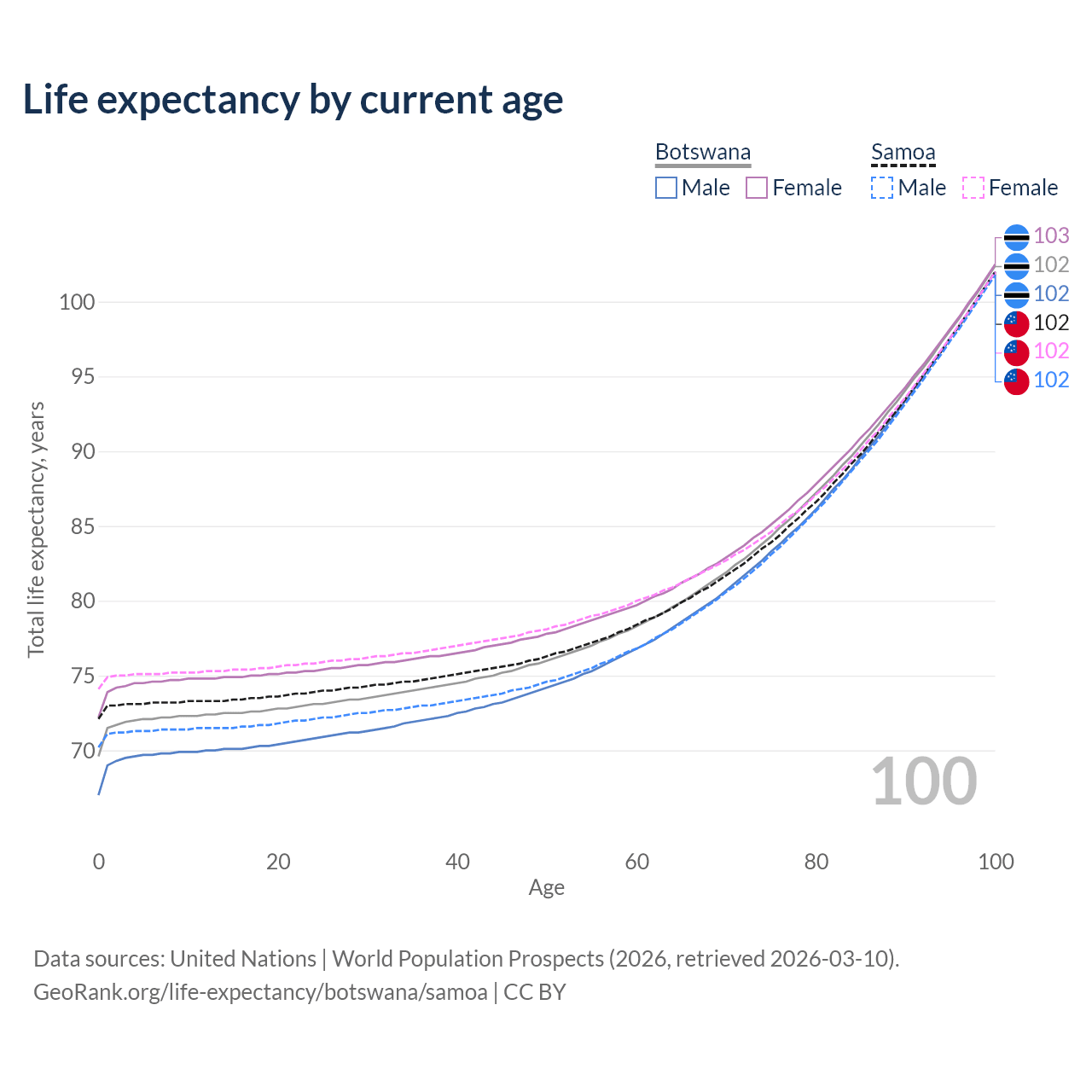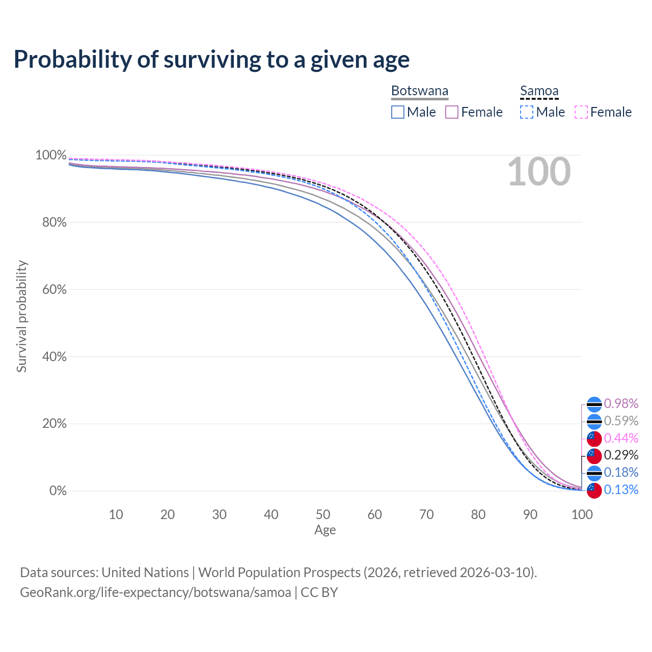This life expectancy calculator shows the odds of living to 100, 95, 90, and below based on current age for both males and females in Botswana and Samoa, along with mean and median age of death. The calculations are based on the 2026 life tables (actuarial tables) from the UN World Population Prospects.