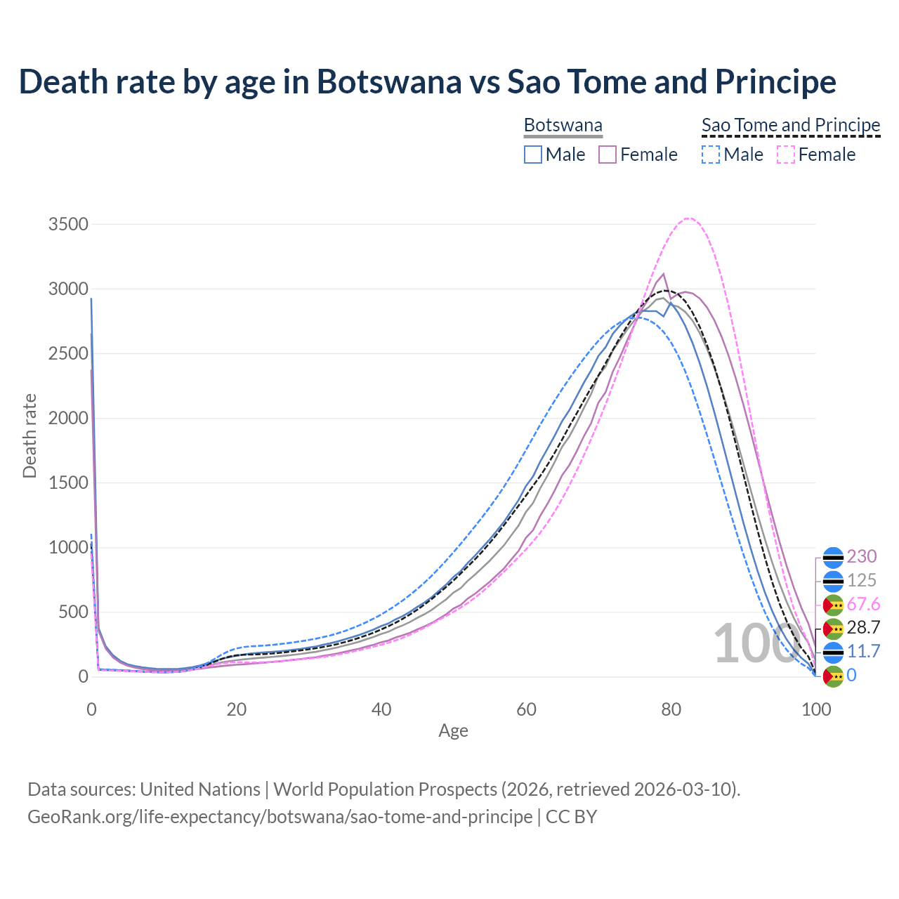 In Botswana, the most common age of death is 79, compared to 79 in Sao Tome and Principe. The median age of death is 74.4 in Botswana and 74.1 in Sao Tome and Principe, meaning only half of each cohort is expected to live past that age.