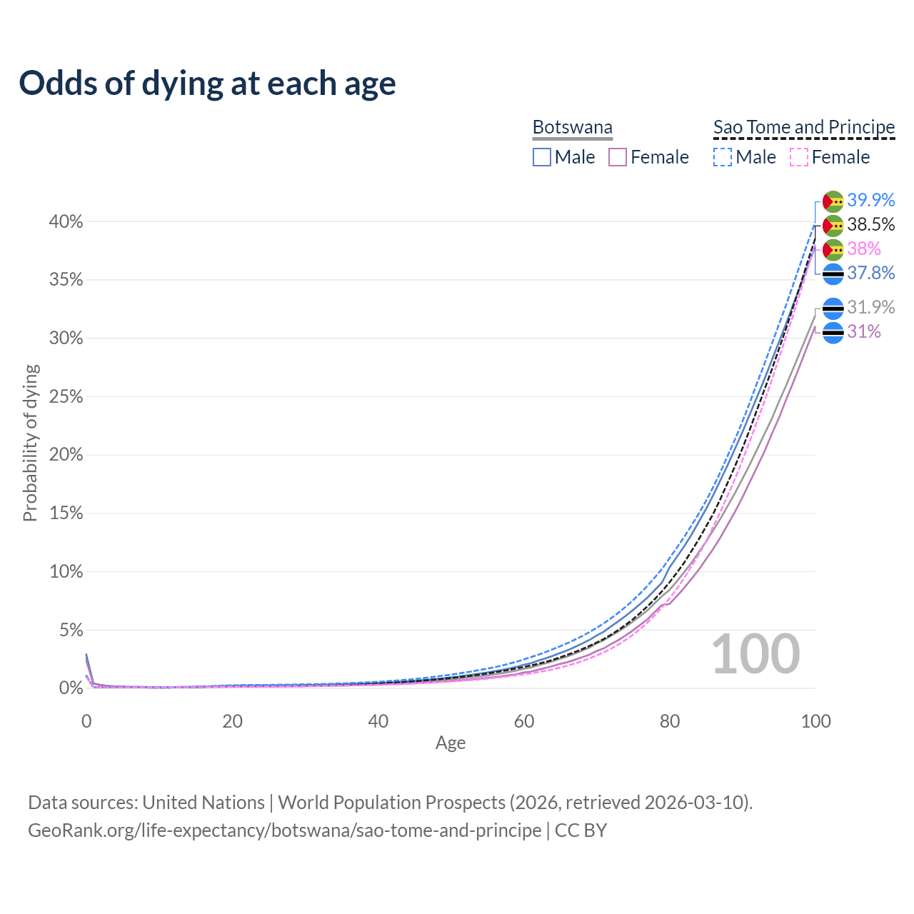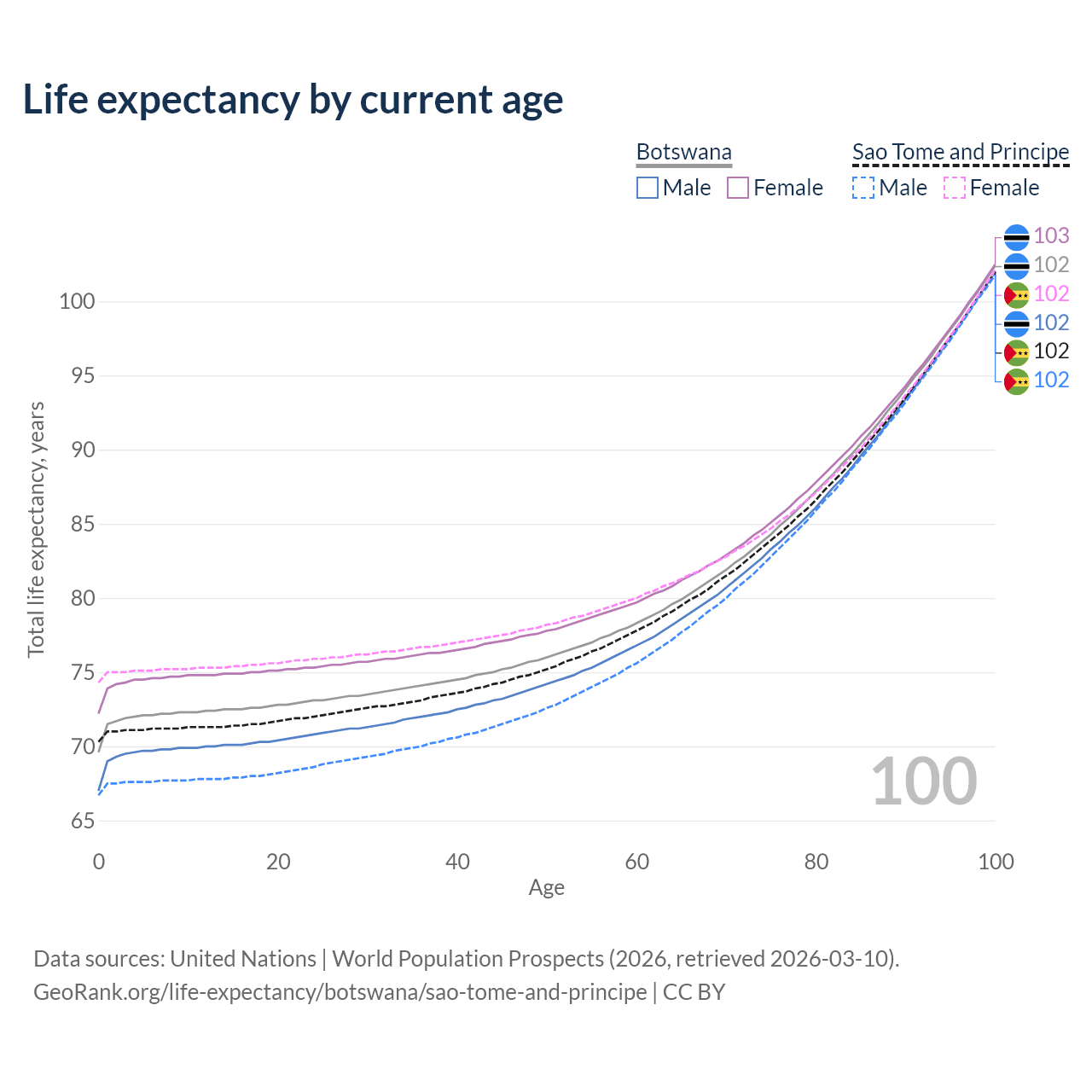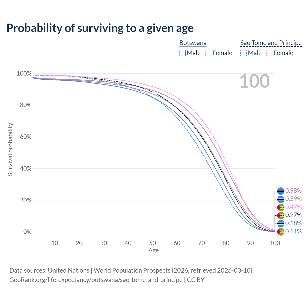 This life expectancy calculator shows the odds of living to 100, 95, 90, and below based on current age for both males and females in Botswana and Sao Tome and Principe, along with mean and median age of death. The calculations are based on the 2026 life tables (actuarial tables) from the UN World Population Prospects.