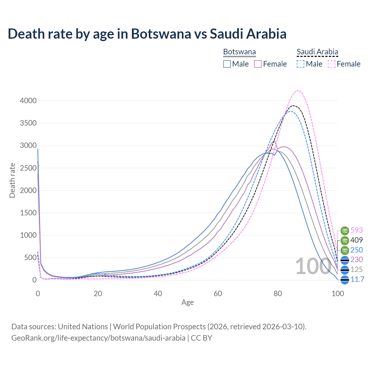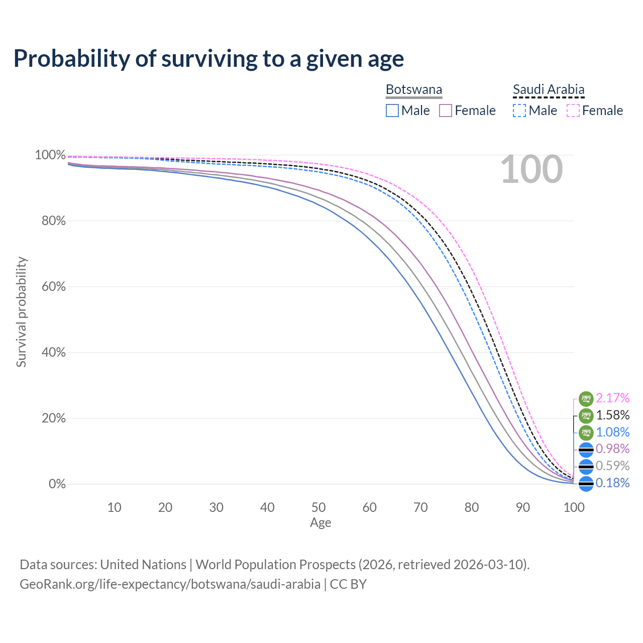 This life expectancy calculator shows the odds of living to 100, 95, 90, and below based on current age for both males and females in Botswana and Saudi Arabia, along with mean and median age of death. The calculations are based on the 2026 life tables (actuarial tables) from the UN World Population Prospects.