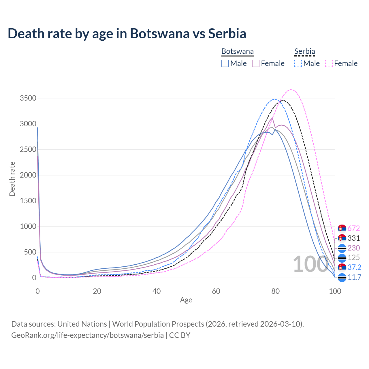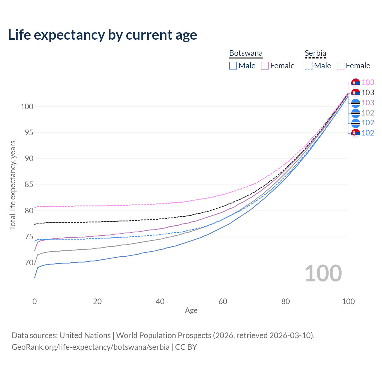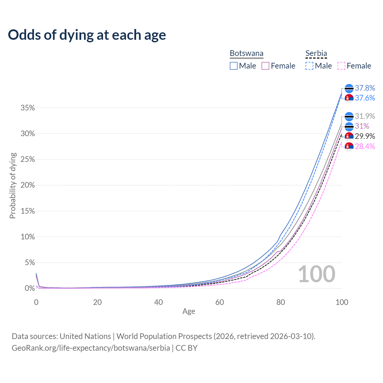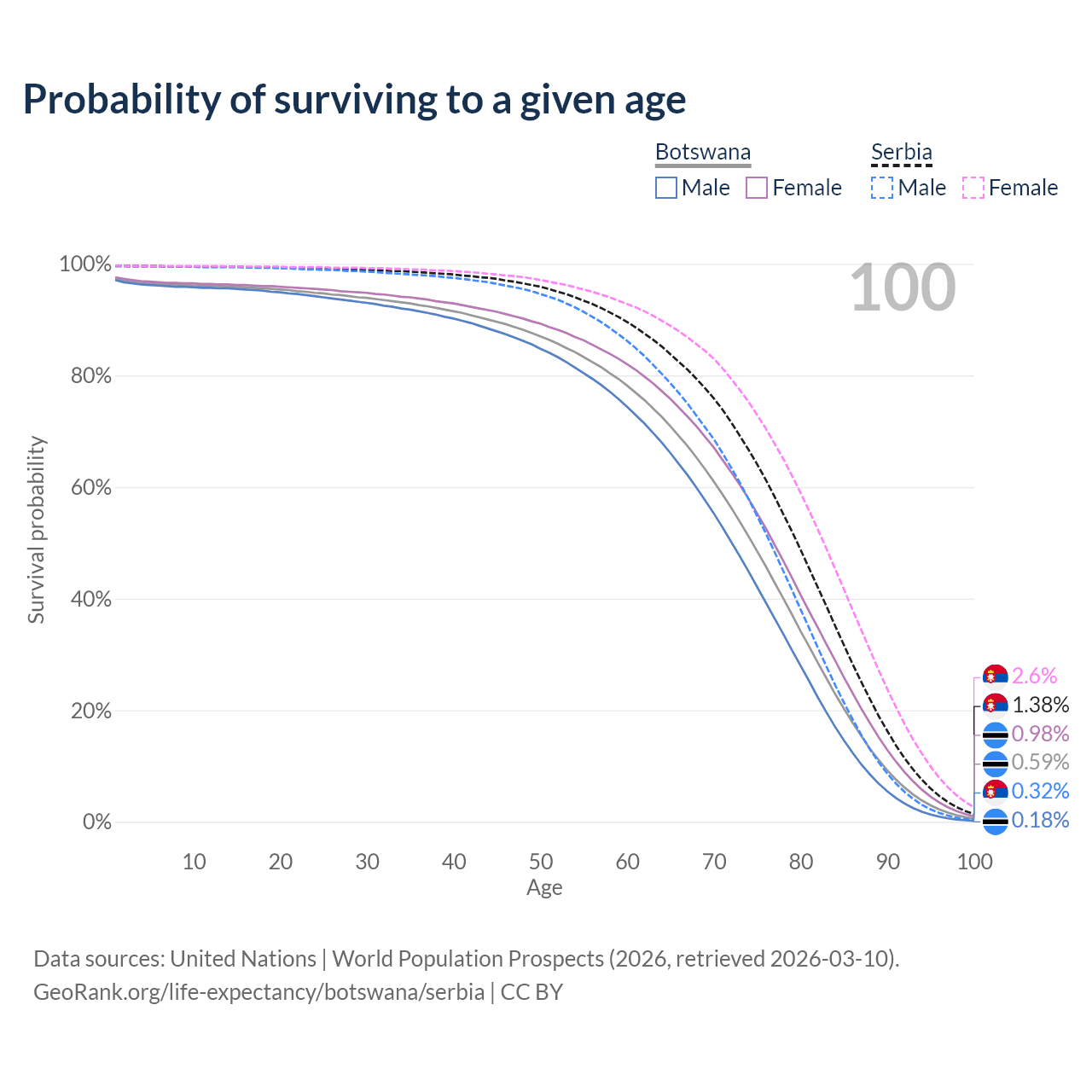 This life expectancy calculator shows the odds of living to 100, 95, 90, and below based on current age for both males and females in Botswana and Serbia, along with mean and median age of death. The calculations are based on the 2026 life tables (actuarial tables) from the UN World Population Prospects.