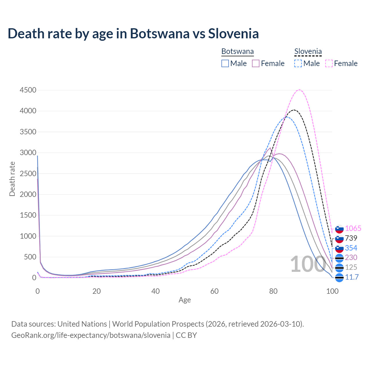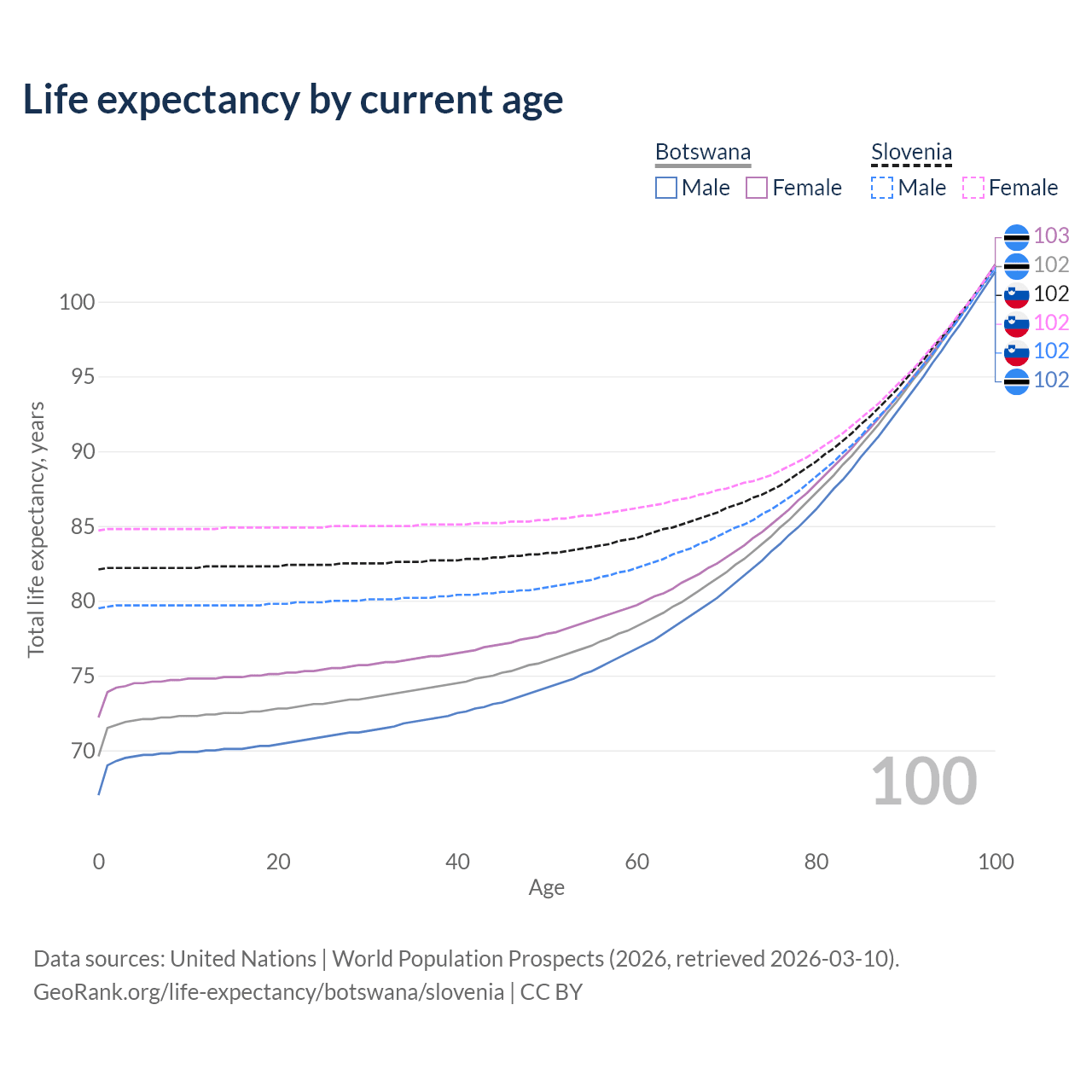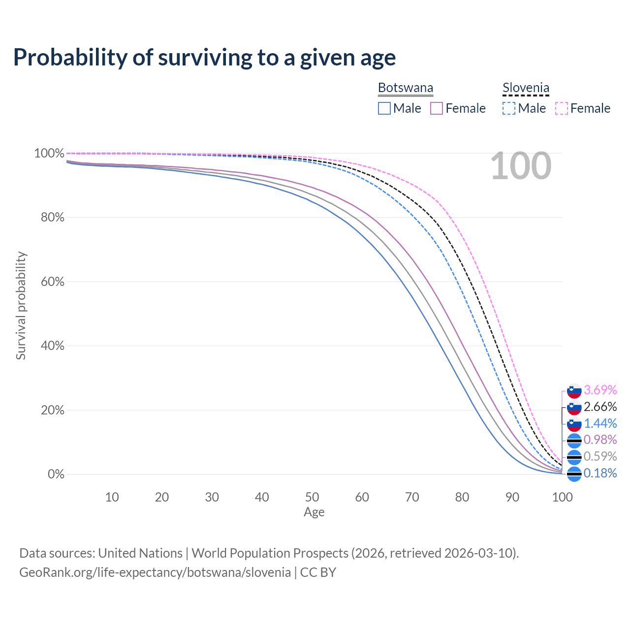 This life expectancy calculator shows the odds of living to 100, 95, 90, and below based on current age for both males and females in Botswana and Slovenia, along with mean and median age of death. The calculations are based on the 2026 life tables (actuarial tables) from the UN World Population Prospects.
