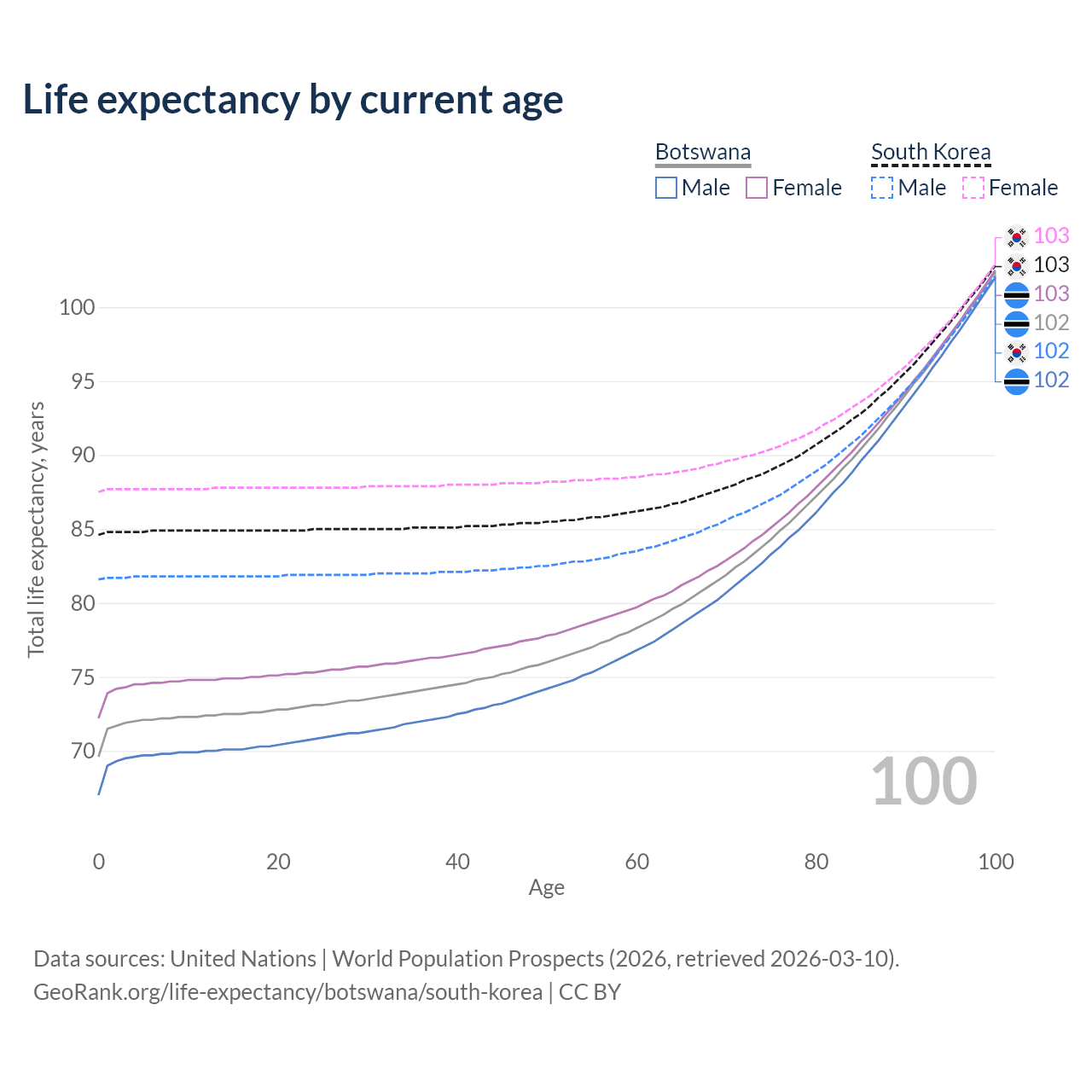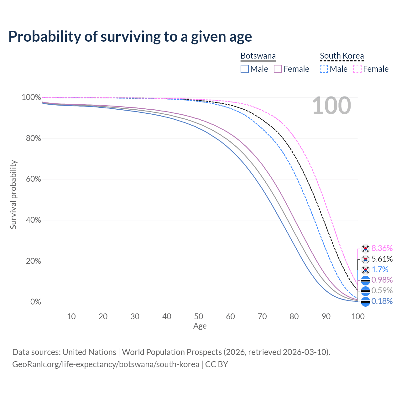 This life expectancy calculator shows the odds of living to 100, 95, 90, and below based on current age for both males and females in Botswana and South Korea, along with mean and median age of death. The calculations are based on the 2026 life tables (actuarial tables) from the UN World Population Prospects.