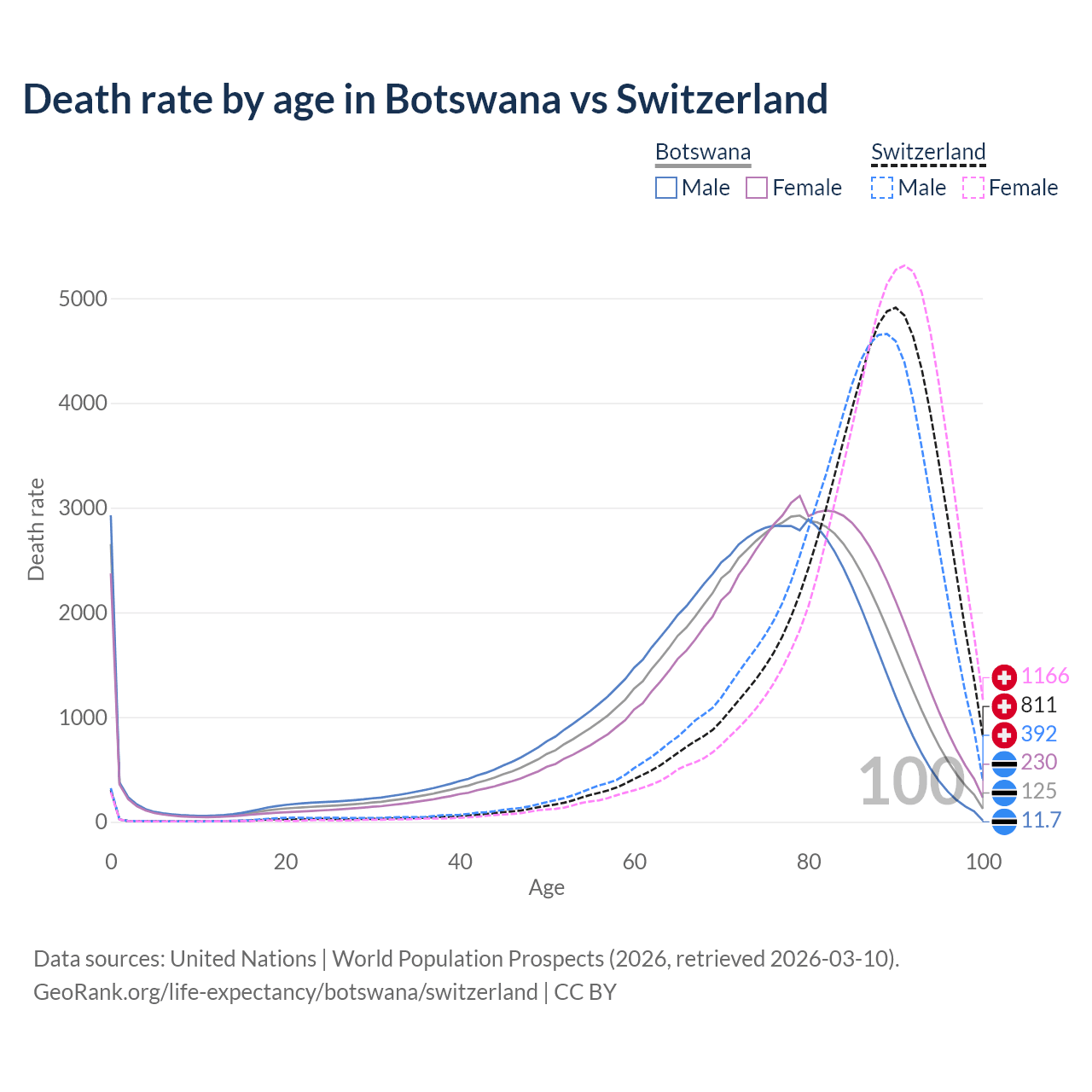 In Botswana, the most common age of death is 79, compared to 90 in Switzerland. The median age of death is 74.4 in Botswana and 87.2 in Switzerland, meaning only half of each cohort is expected to live past that age.