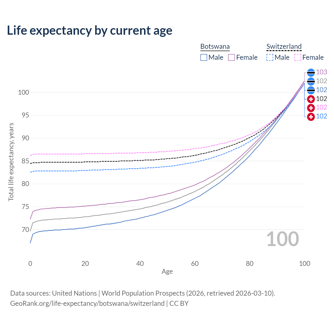 This life expectancy calculator shows the odds of living to 100, 95, 90, and below based on current age for both males and females in Botswana and Switzerland, along with mean and median age of death. The calculations are based on the 2026 life tables (actuarial tables) from the UN World Population Prospects.