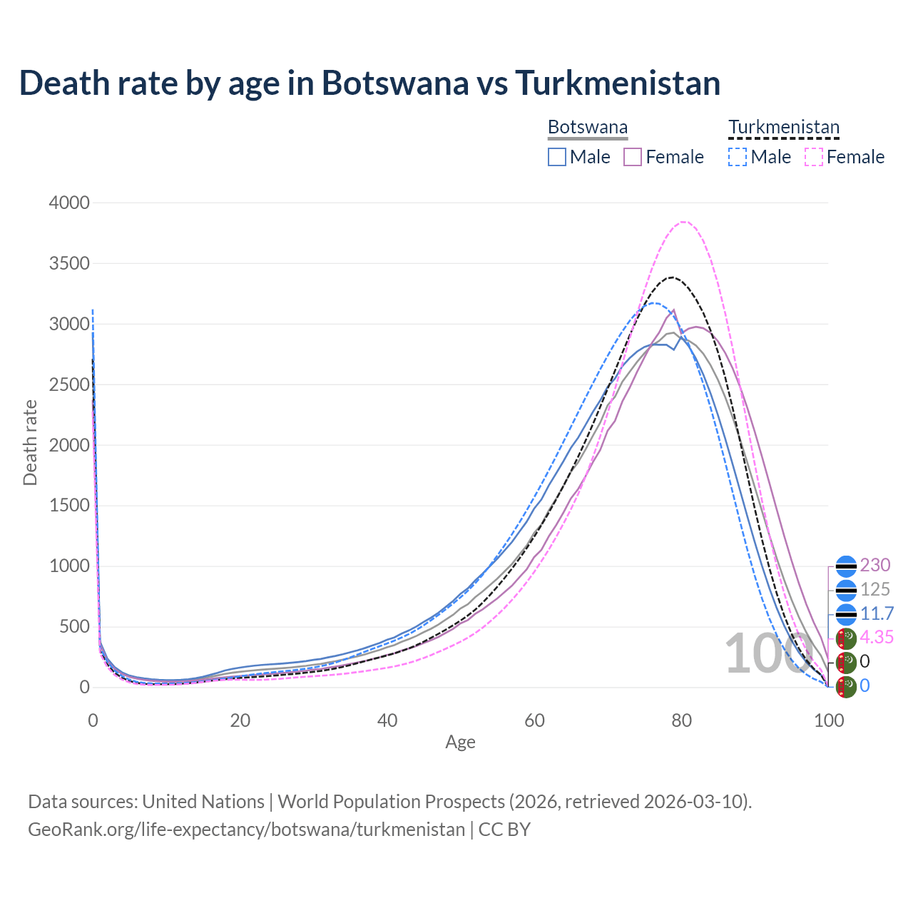 In Botswana, the most common age of death is 79, compared to 79 in Turkmenistan. The median age of death is 74.4 in Botswana and 75.1 in Turkmenistan, meaning only half of each cohort is expected to live past that age.