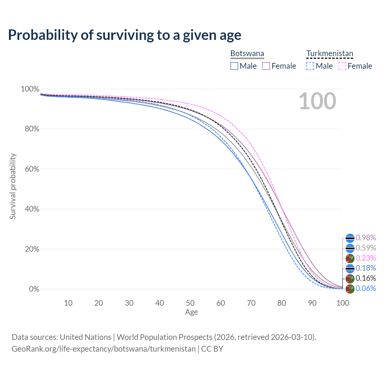 This life expectancy calculator shows the odds of living to 100, 95, 90, and below based on current age for both males and females in Botswana and Turkmenistan, along with mean and median age of death. The calculations are based on the 2026 life tables (actuarial tables) from the UN World Population Prospects.