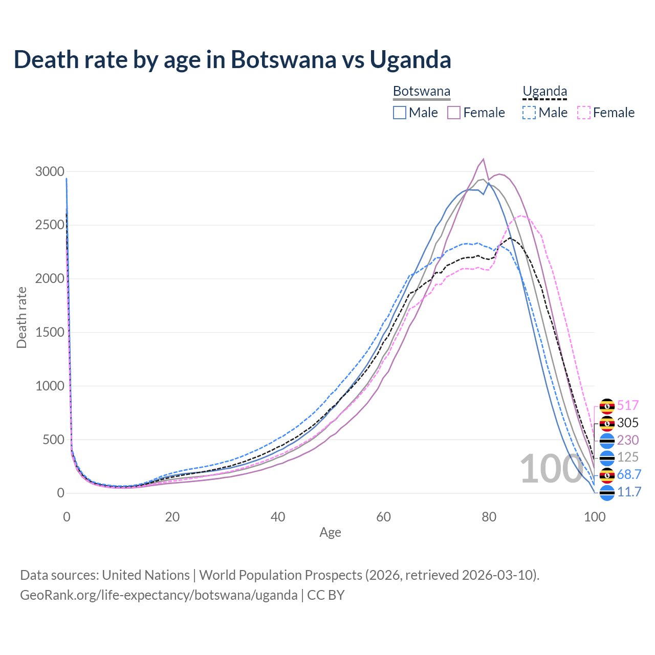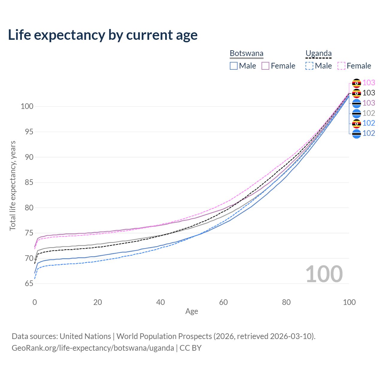 This life expectancy calculator shows the odds of living to 100, 95, 90, and below based on current age for both males and females in Botswana and Uganda, along with mean and median age of death. The calculations are based on the 2026 life tables (actuarial tables) from the UN World Population Prospects.