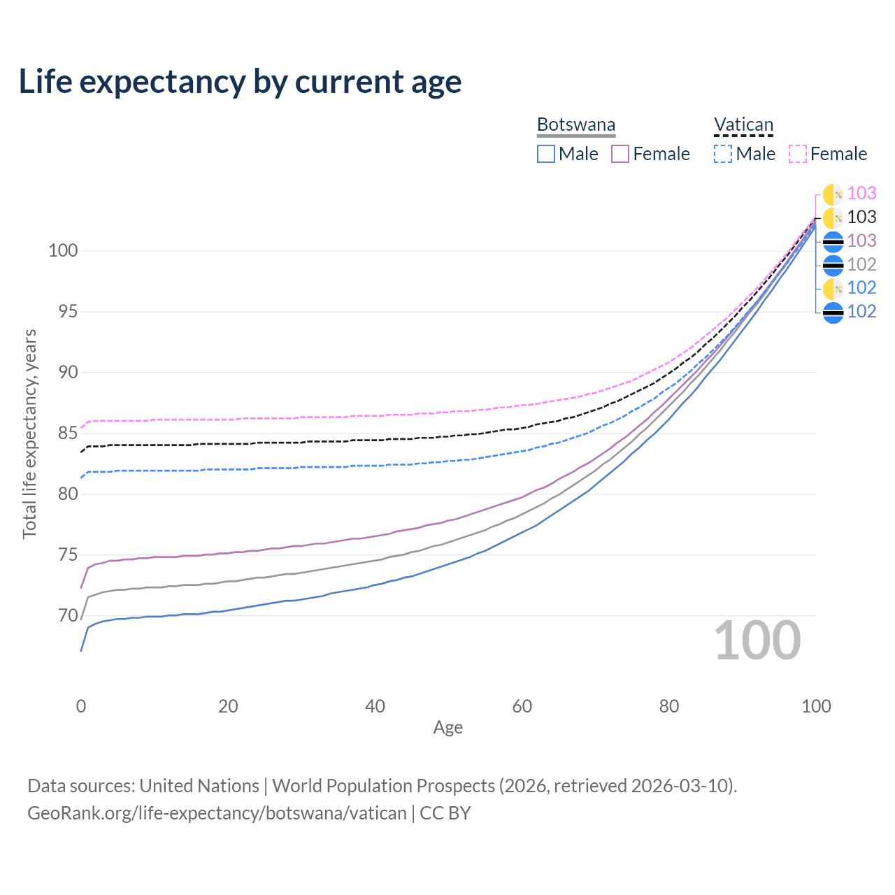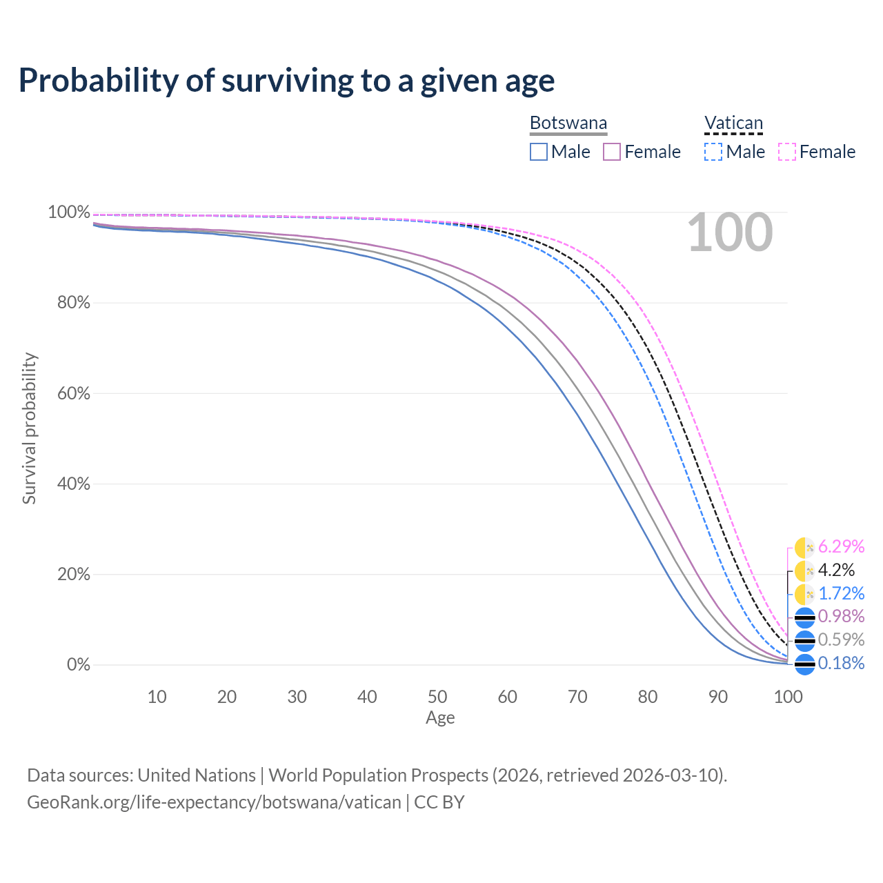 This life expectancy calculator shows the odds of living to 100, 95, 90, and below based on current age for both males and females in Botswana and the Vatican, along with mean and median age of death. The calculations are based on the 2026 life tables (actuarial tables) from the UN World Population Prospects.