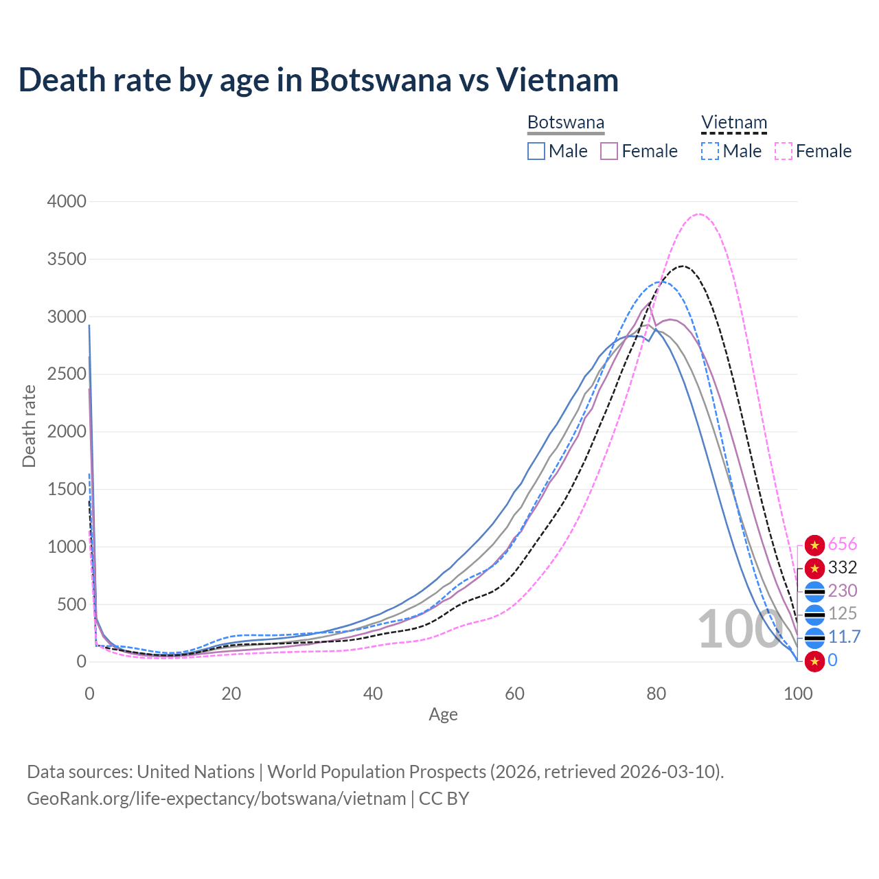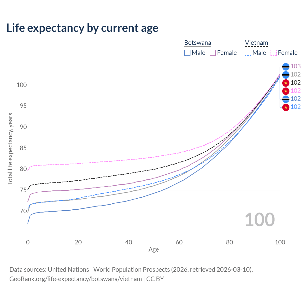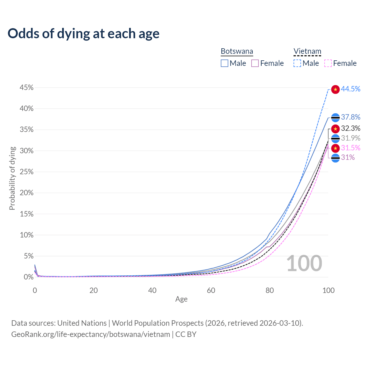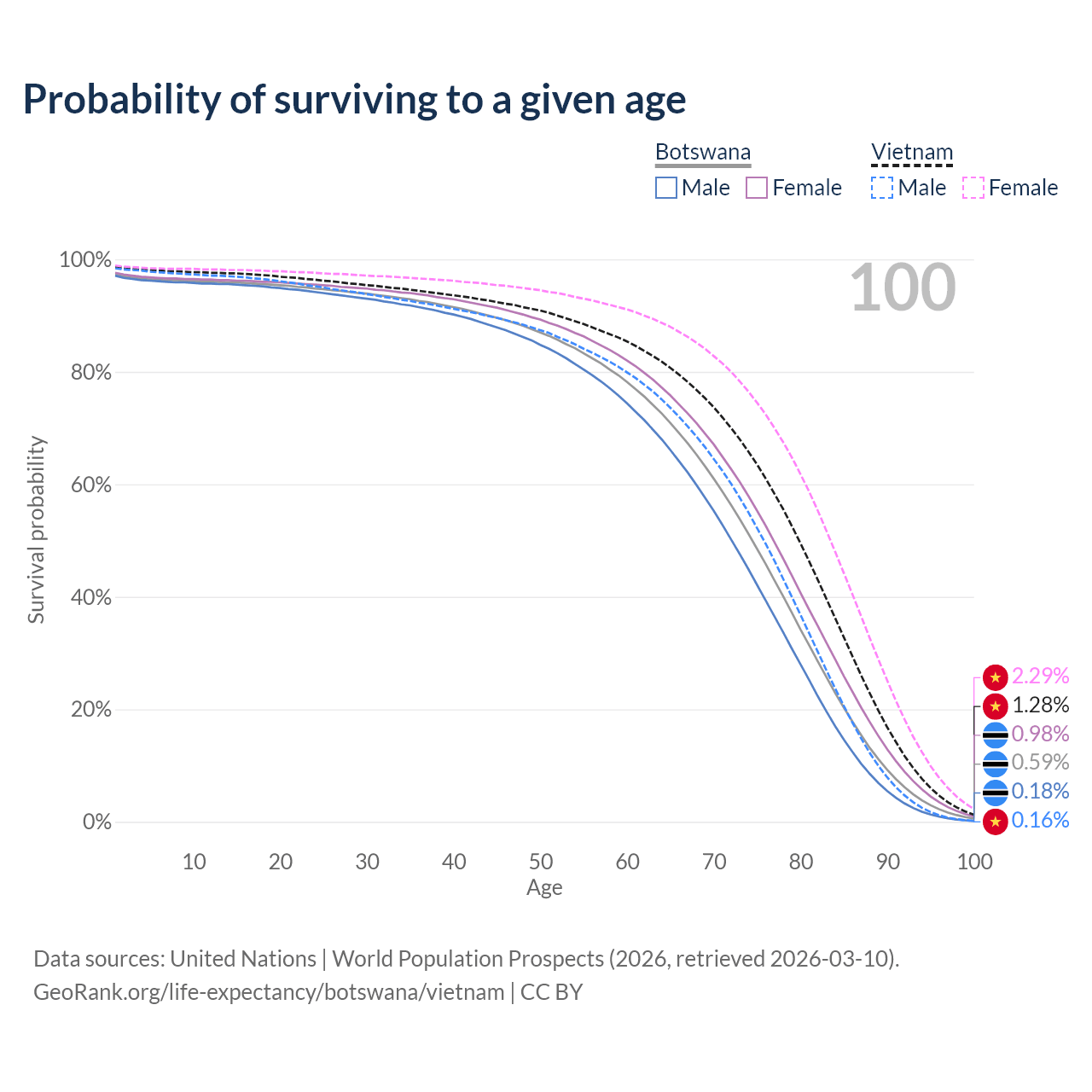 This life expectancy calculator shows the odds of living to 100, 95, 90, and below based on current age for both males and females in Botswana and Vietnam, along with mean and median age of death. The calculations are based on the 2026 life tables (actuarial tables) from the UN World Population Prospects.