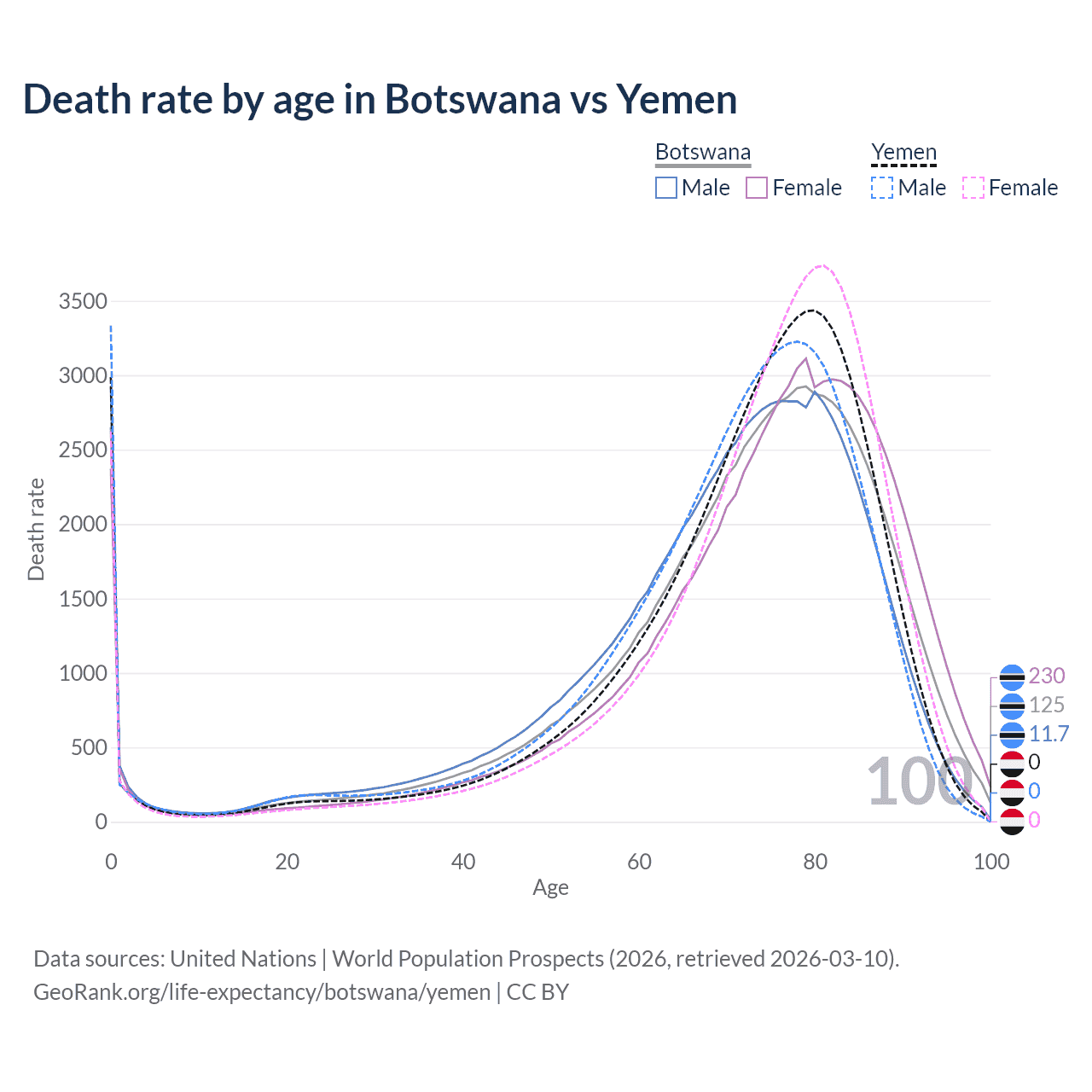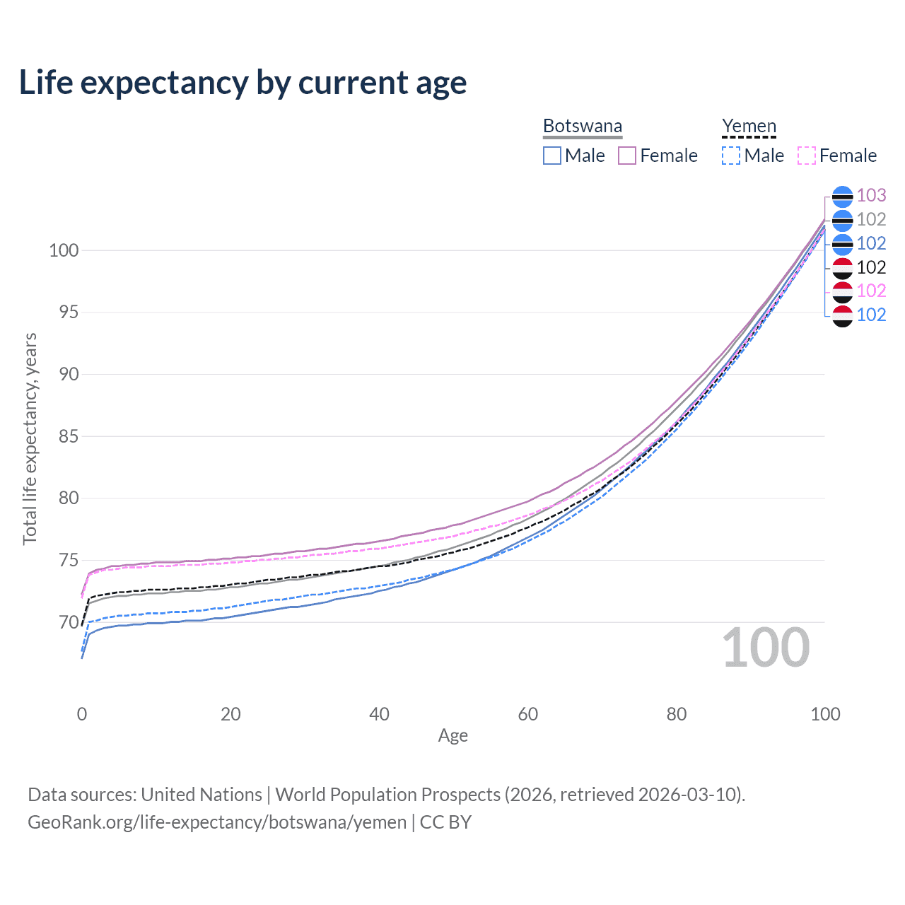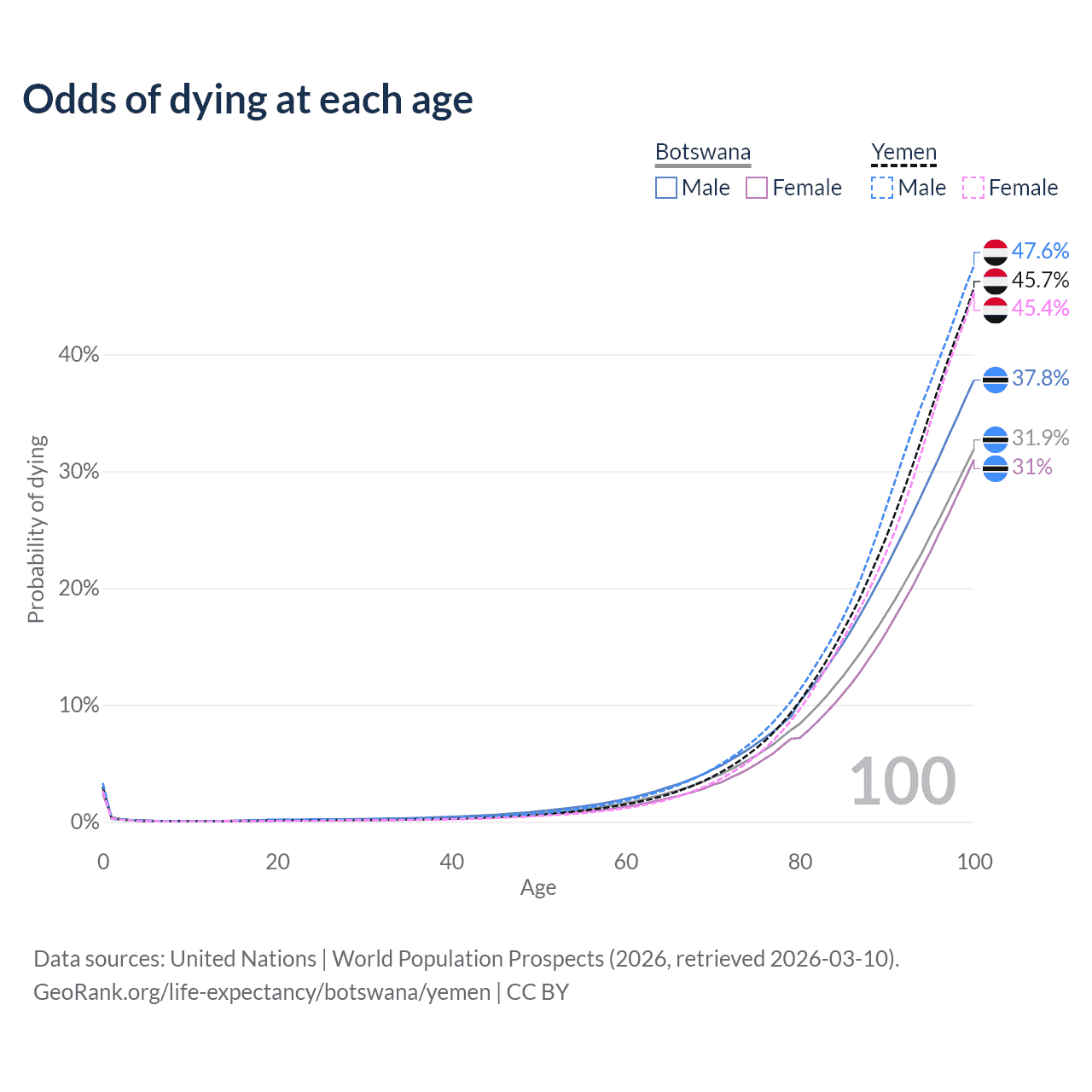 This life expectancy calculator shows the odds of living to 100, 95, 90, and below based on current age for both males and females in Botswana and Yemen, along with mean and median age of death. The calculations are based on the 2026 life tables (actuarial tables) from the UN World Population Prospects.